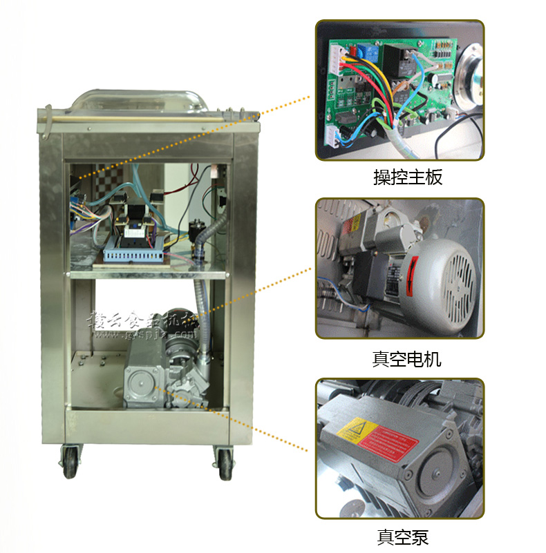 3、壓下真空蓋,面板上的抽氣指示燈亮,真空泵開始抽氣,機(jī)蓋即被自動吸引,抽真空時間可根據(jù)包裝要求調(diào)節(jié)適當(dāng)時間。