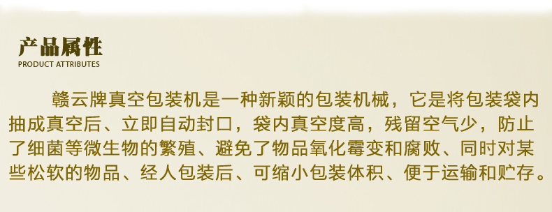 贛云牌真空包裝機(jī)是一種新穎的包裝機(jī)械,它是將包裝袋內(nèi)抽成真空后、立即自動封口,袋內(nèi)真空度高,殘留空氣少,防止了細(xì)菌等微生物的繁殖、避免了物品氧化霉變和腐敗、同時對某些松軟的物品、經(jīng)人包裝后、可縮小包裝體積、便于運(yùn)輸和貯存。