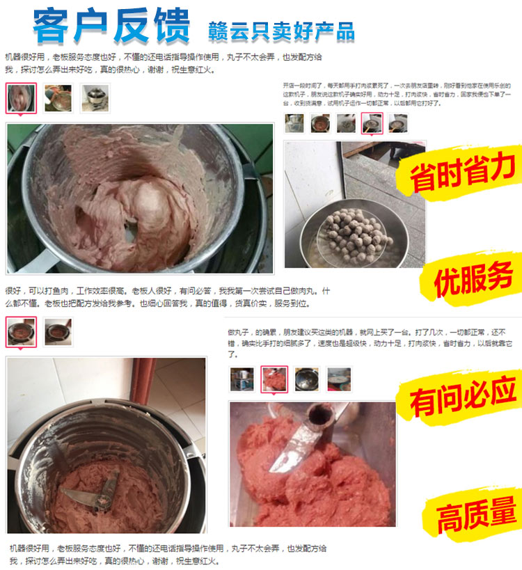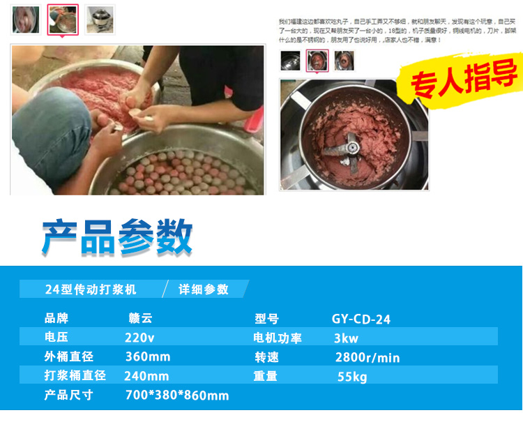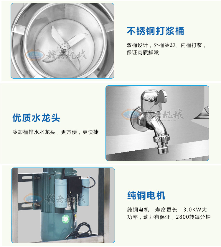 贛云牌全不銹鋼傳動高速肉丸打漿機,整機采用優(yōu)質(zhì)不銹鋼材質(zhì),拉伸桶底部弧形設(shè)計,贛云新款肉丸打漿機標志性設(shè)計。無縫焊接技術(shù)展現(xiàn)高檔品質(zhì)。一次性可打肉漿5-6斤,2分鐘左右即可完成肉漿的制作。所打肉漿細膩,是肉丸專用打漿設(shè)備之一。