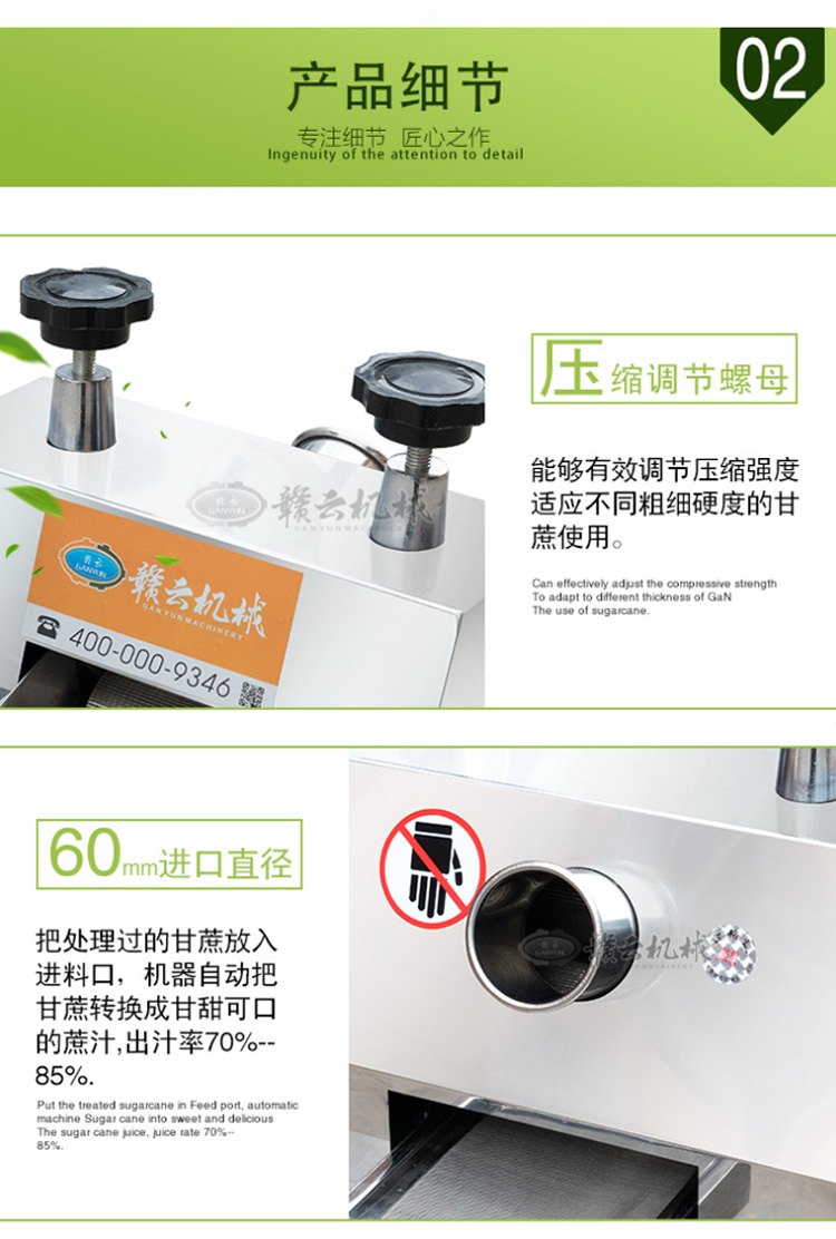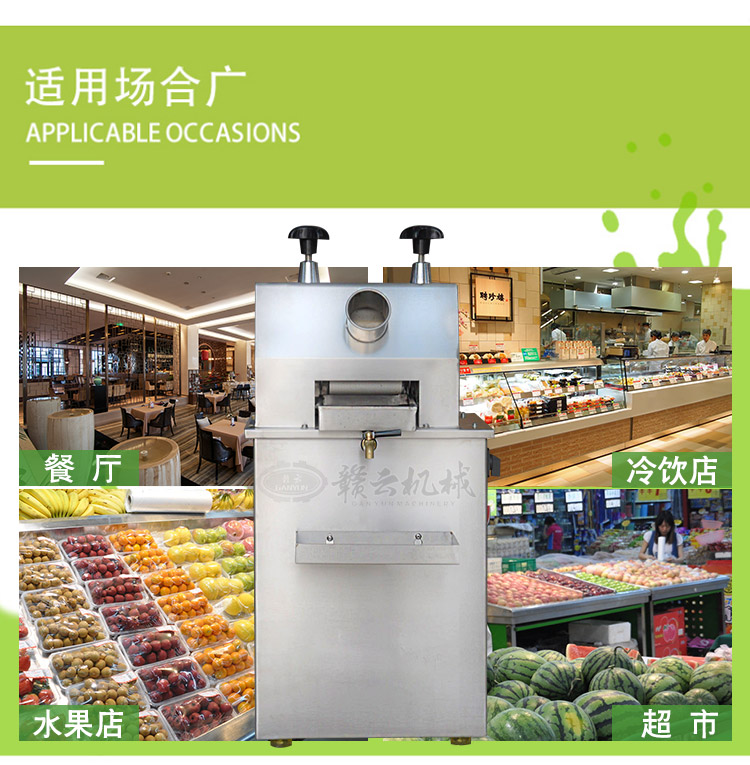 本產(chǎn)品適用于城鄉(xiāng)商場、菜場、商業(yè)街等人流量集中區(qū)。男女老少均可操作,成本低、利潤高,現(xiàn)榨現(xiàn)賣,是發(fā)家致富的好幫手??杉庸じ收?、生姜、蘋果、高粱桿、玉米桿等進(jìn)行榨汁之用。