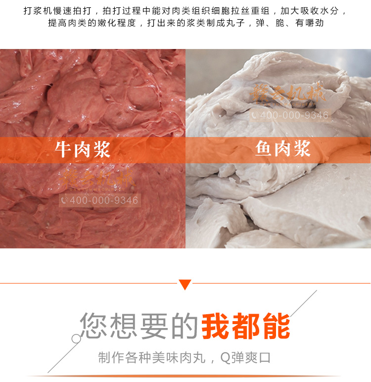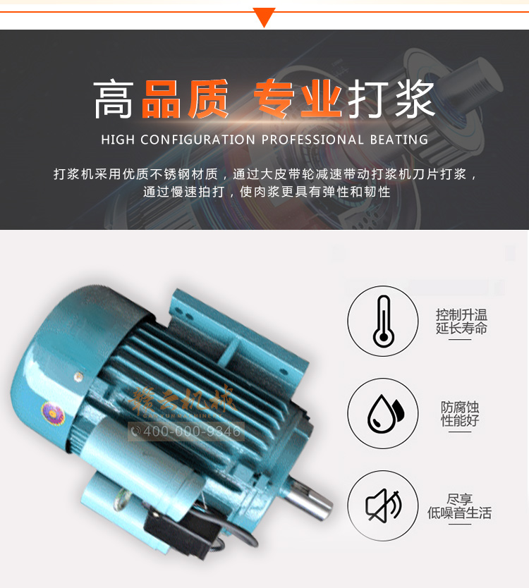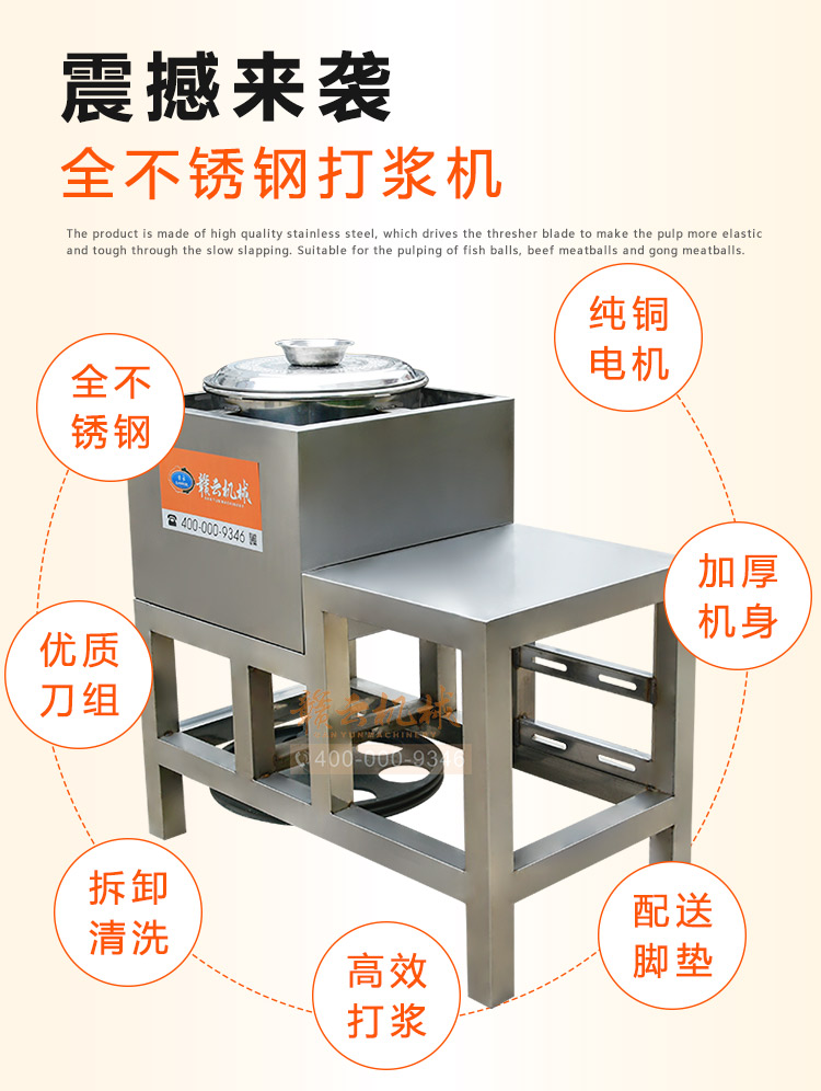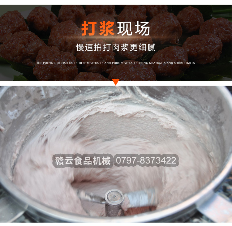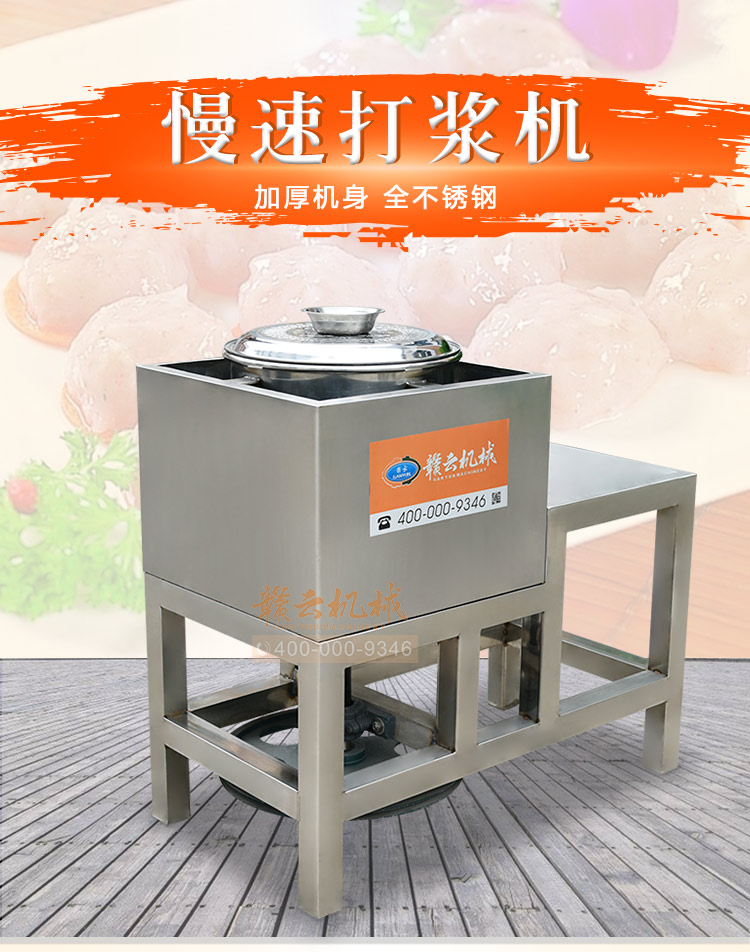 贛云牌全不銹鋼慢速魚丸、肉丸打漿機采用優(yōu)質(zhì)不銹鋼材質(zhì),通過大皮帶輪減速帶動打漿機刀片打漿,通過慢速拍打,使肉漿更具有彈性和韌性。適合魚丸、牛肉丸和貢丸的制漿之用。