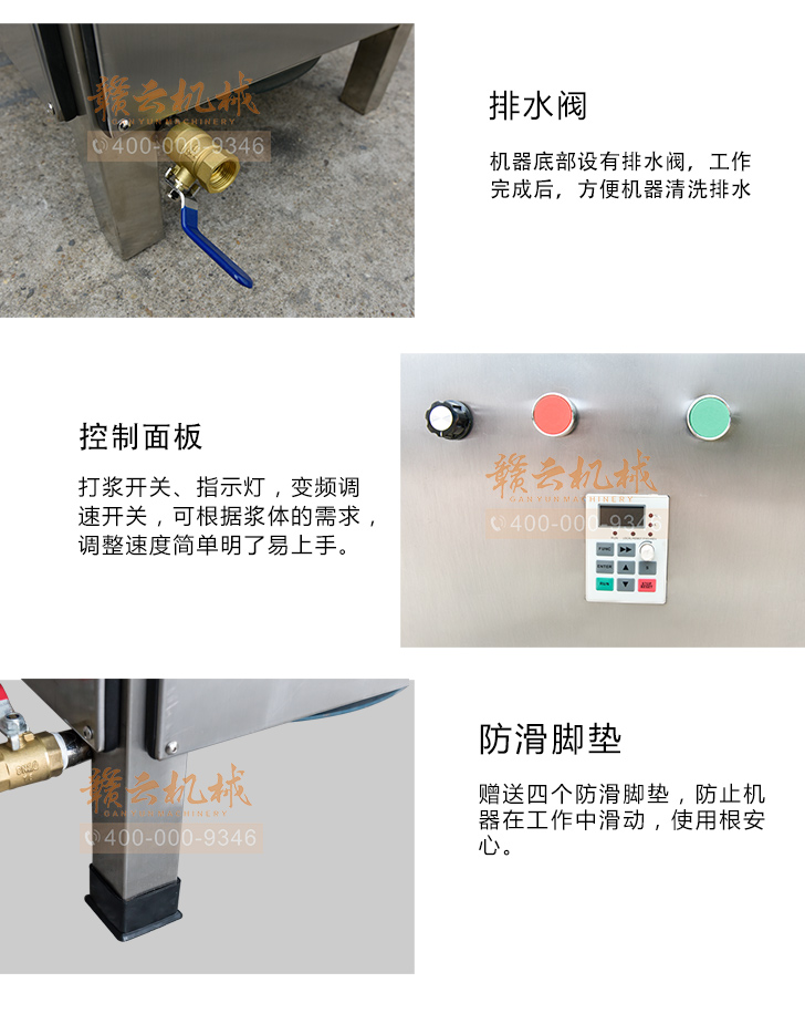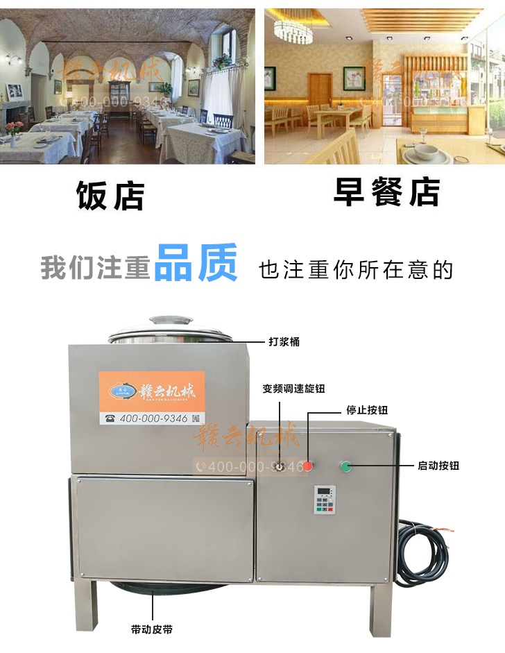 贛云牌36型全封閉式慢速變頻肉丸打漿機選優(yōu)質不銹鋼,在全不銹鋼慢速肉丸打漿機基礎上將整機外殼用不銹鋼板材封裝,更好的保護電動機,通過小皮帶輪帶動大皮帶輪減速,慢速拍打肉漿。
