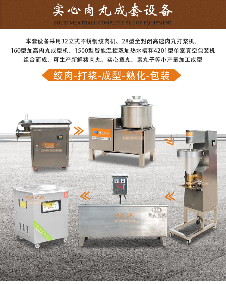 帶真空包裝新鮮豬肉丸,帶魚(yú)刺感魚(yú)丸生產(chǎn)成套設(shè)備,本套設(shè)備采用32立式不銹鋼絞肉機(jī)、28型全封閉高速肉丸打漿機(jī)、160型加高肉丸成型機(jī)、1500型智能溫控雙加熱水槽和4201型單室真空包裝機(jī)組合而成,可生產(chǎn)新鮮豬肉丸、實(shí)心魚(yú)丸、素丸子等小產(chǎn)量加工成型