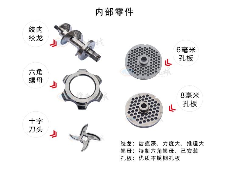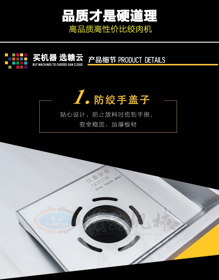 高質(zhì)量高性價(jià)比絞肉機(jī) 防絞手蓋子 貼心設(shè)計(jì) 防止絞肉時(shí)傷到手指 放料托盤 包邊設(shè)計(jì) 安全放心 防水開關(guān)人性化設(shè)計(jì) 人體工程學(xué)把手 方便搬運(yùn) 配有萬向輪 裝配有純銅電機(jī)