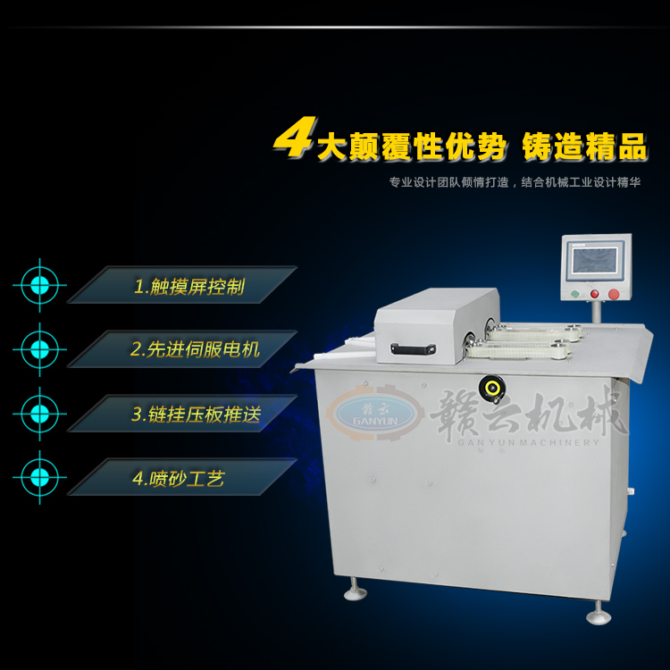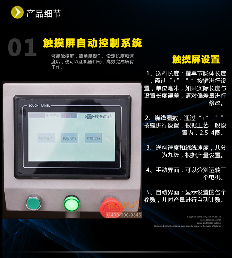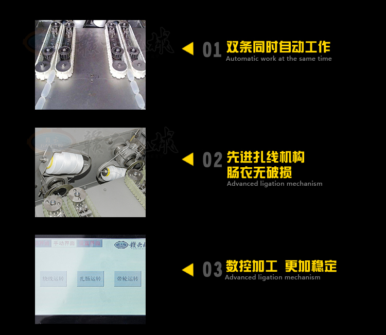 該香腸扎線機機械的優(yōu)點是節(jié)約腸衣,并且線扎的產(chǎn)品不用人工和機械剪節(jié),相對扭結(jié)可節(jié)約人工3人以上和對剪節(jié)設(shè)備的投入;相對半自動扎線機可節(jié)約10人的費用,切免除工人的體力勞動之苦。該扎線機操控十分簡單,由于采用人機對話的液晶屏,設(shè)定長度和速度后,便可以讓機械自動高效完成所有工作。