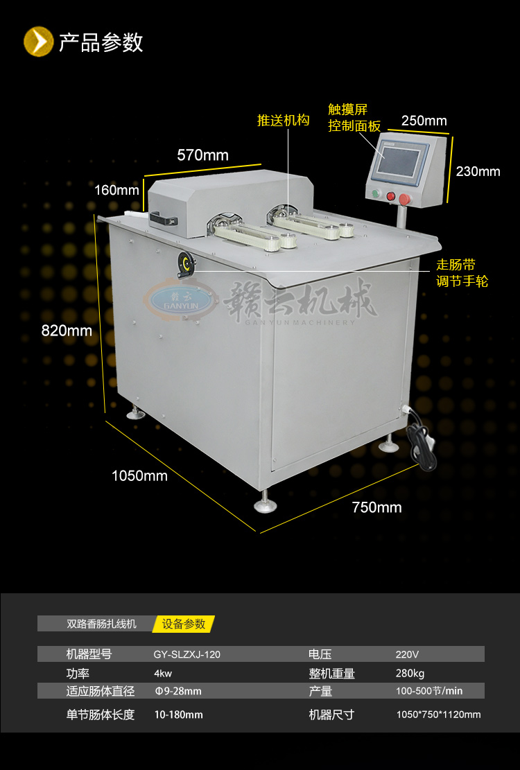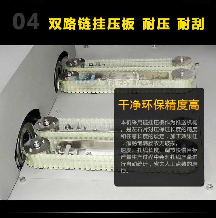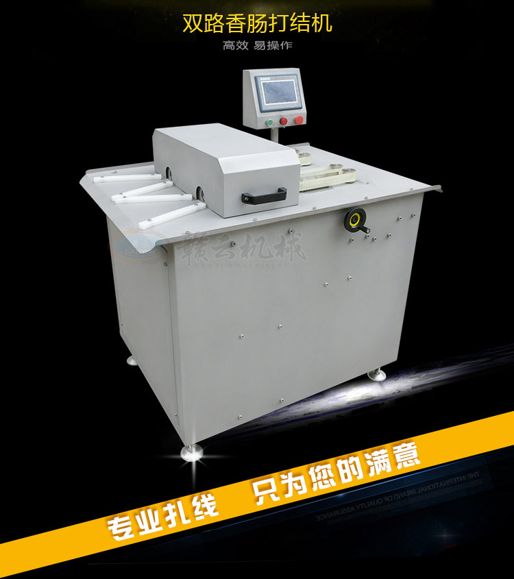 全自動動雙路高速香腸扎線機,自動分份,自動繞線,全程自動化控制。該機采用了優(yōu)質(zhì)電機和本公司自主研發(fā)的控制系統(tǒng),機身全不銹鋼制造、效率高、易操控、節(jié)約生產(chǎn)原料等優(yōu)點,產(chǎn)品長度的調(diào)節(jié)可以隨心所欲