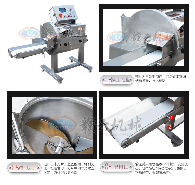GYSQ-120D切熟肉機(jī),專業(yè)切熟肉機(jī)可切扣肉、鹵豬耳朵、五花肉等,通過調(diào)整輸送帶的速度控制切割厚度,輸送帶越快厚度越厚,越慢越薄。適用于食堂、中央廚房、餐飲配送中心、肉聯(lián)廠、大型酒店等。變頻電控箱,通過調(diào)節(jié)輸送帶速度控制切割厚度,按鍵防水設(shè)計,可拆卸輸送帶。優(yōu)質(zhì)刀片,杜絕卷刃。