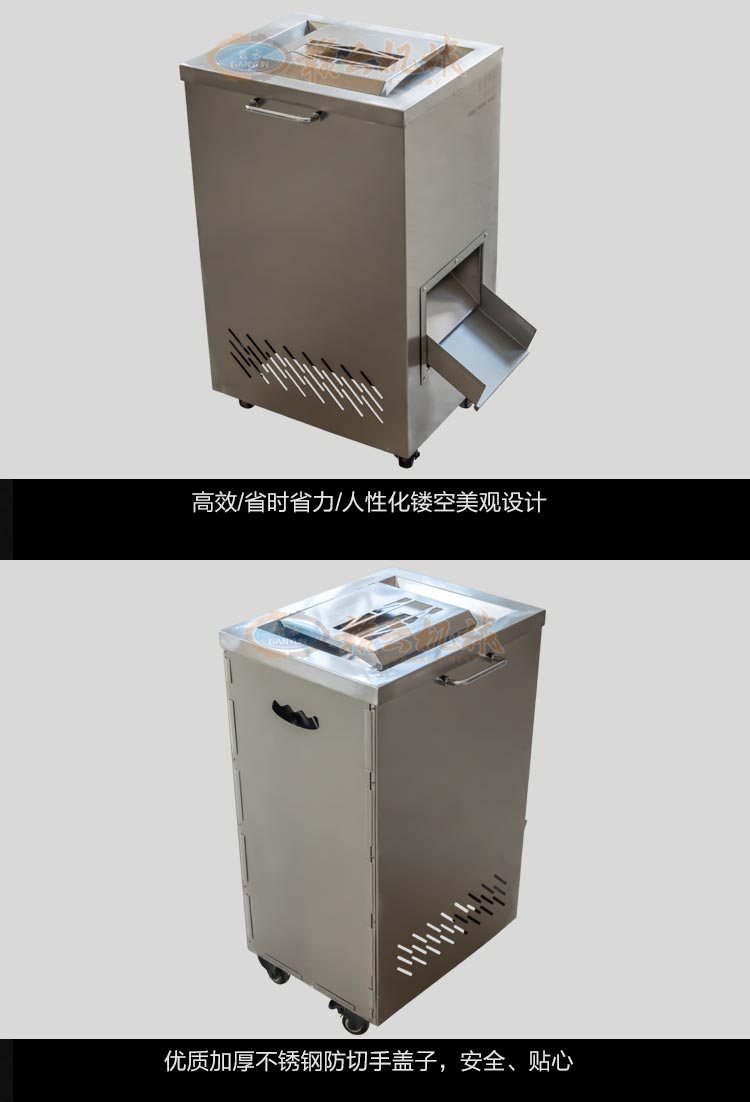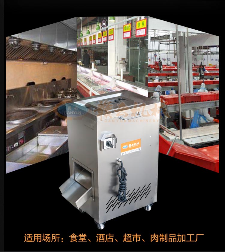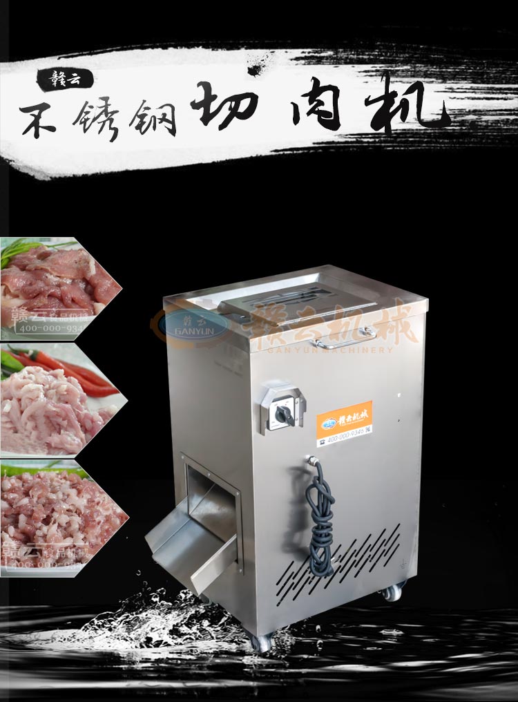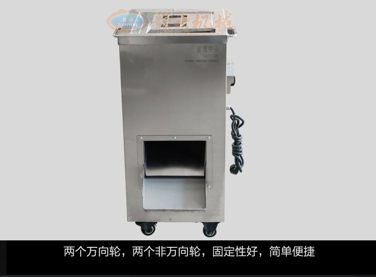 不銹鋼切肉機不銹鋼切肉機,進料口鏤空設(shè)計,方便看到下料進度,進料口防護蓋板材加厚,堅固耐用。鋒利刀片,刀間距3.5mm,切切肉片、肉絲、肉粒。防水旋鈕開關(guān)。折疊出料口,節(jié)省空間,推回可防止料斗刮壞。側(cè)板拆卸可看到電機。304不銹鋼機身,兩個萬向輪,兩個非萬向輪,容易固定,省心。