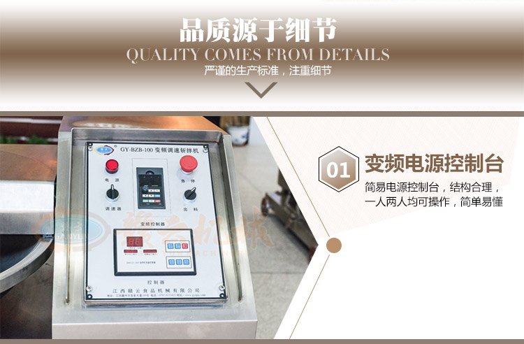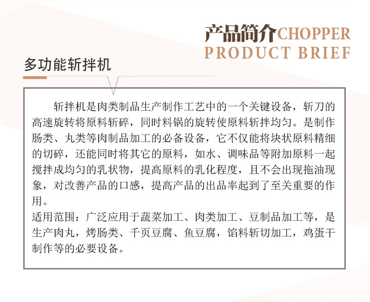 斬拌機(jī)是肉類制品生產(chǎn)制作工藝中的一個關(guān)鍵設(shè)備,斬刀的高速旋轉(zhuǎn)將原料斬碎,同時料鍋的旋轉(zhuǎn)使原料斬拌均勻。適用于制作腸類、丸類等肉制品加工設(shè)備,它不僅能將塊狀原料精細(xì)的切碎,還能同時將其它的原料,如水、調(diào)味品等附加原料一起攪拌成均勻的乳狀物,提高原料的乳化程度,且不會出現(xiàn)拖油現(xiàn)象,對改善產(chǎn)品的口感,提高產(chǎn)品的出品率起到了關(guān)鍵的作用。適用范圍:廣泛應(yīng)用于蔬菜加工、肉類加工、豆制品加工等,是生產(chǎn)肉丸,烤腸類、千頁豆腐、魚豆腐,餡料斬切加工,雞蛋干制作等的推薦設(shè)備。