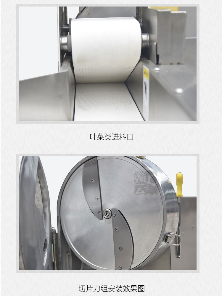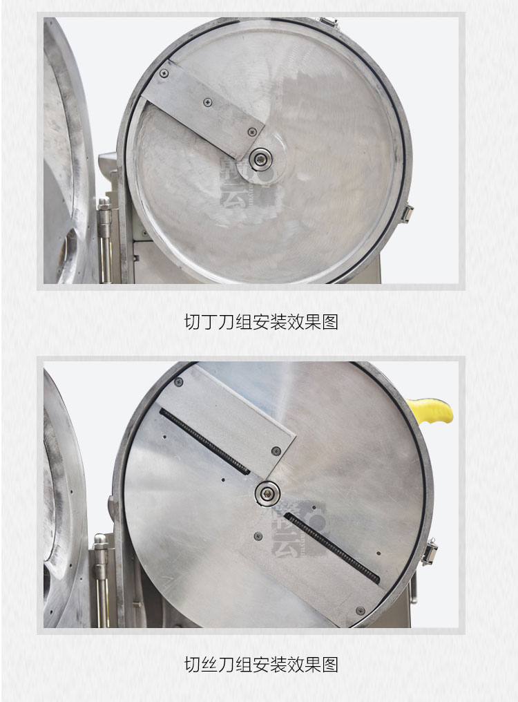 2.通過更換刀盤或雙調(diào)頻調(diào)節(jié)輸送帶與斬刀速度,可切出各種規(guī)格的片、絲、丁、條、粒。