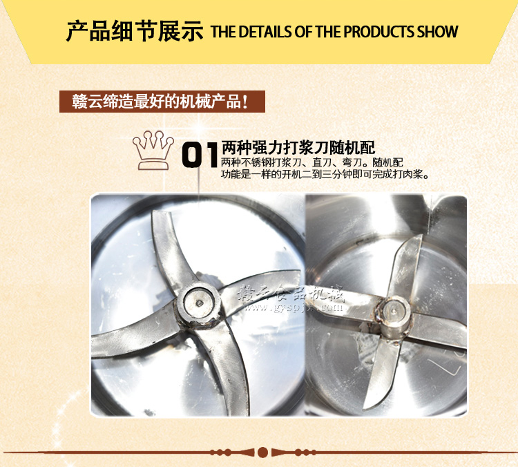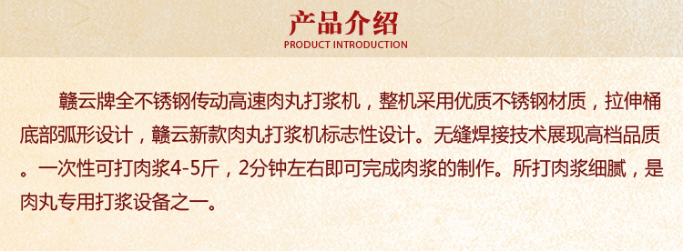 贛云牌全不銹鋼傳動高速肉丸打漿機,整機采用優(yōu)質不銹鋼材質,拉伸桶底部弧形設計,贛云新款肉丸打漿機標志性設計。無縫焊接技術展現高檔品質。一次性可打肉漿4-5斤,2分鐘左右即可完成肉漿的制作。所打肉漿細膩,是肉丸專用打漿設備之一。