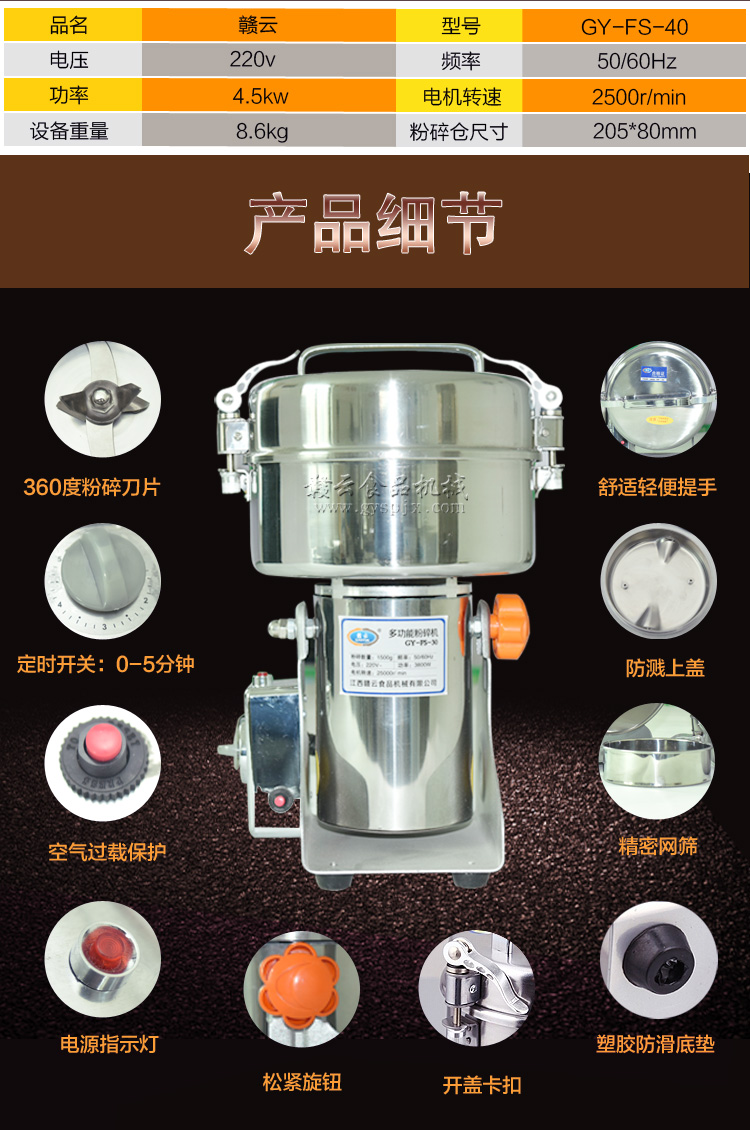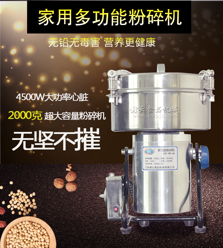 贛云系列多功能粉碎機(jī)采用純銅高速電機(jī)帶動(dòng)粉碎刀片將物料快速打成粉末,可用于粉碎五谷、雜糧、田七、阿膠、白叁等,一般粉碎時(shí)間1-2分鐘即可,新款粉碎機(jī)改保險(xiǎn)絲為空氣過載保護(hù)器,使用更安全,我廠提供的粉碎機(jī)有100克-1000克不同型號(hào)的多功能粉碎機(jī)。