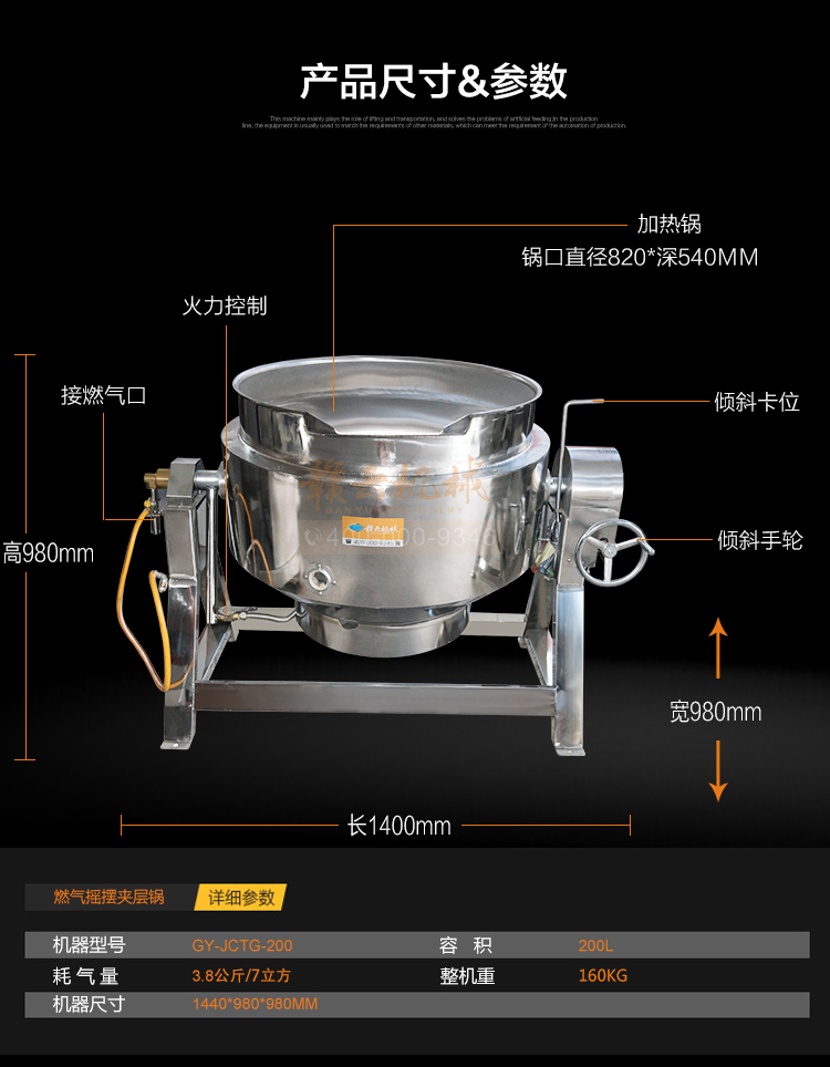 燃氣加熱湯鍋,熬湯鍋,不銹鋼200L大容量湯鍋適用于食堂餐飲連鎖企業(yè),夾層鍋,每小時耗氣量約2.7kg, 天然氣耗氣量為6立方,搖擺式湯鍋