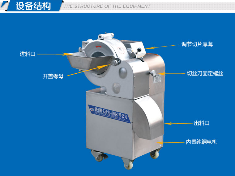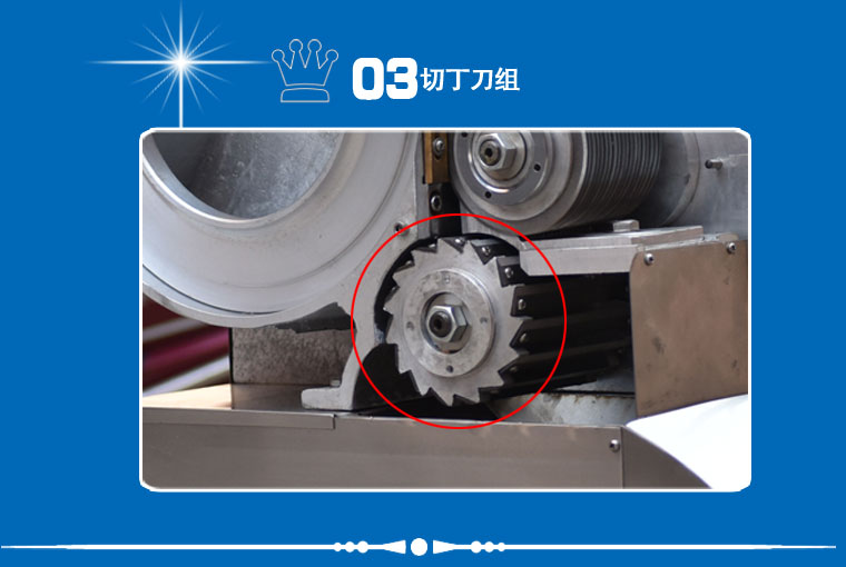工作原理:gy-dq-130型切丁機通過旋轉(zhuǎn)撥盤將被切物體帶動高速旋轉(zhuǎn),利用物體的離心力,立刀將物體切成片狀,然后經(jīng)過圓盤切絲刀片豎切成條狀,并將條狀物送入橫切斷刀口,由橫切斷刀盤切刀切成所需的長方體或立方體。