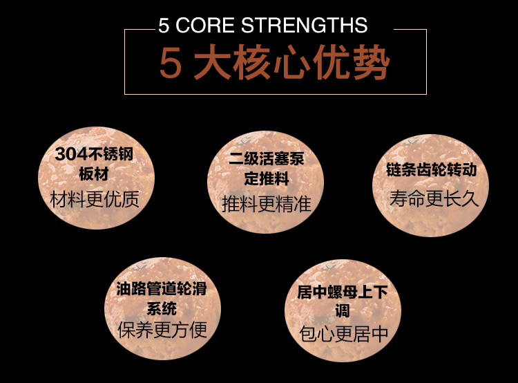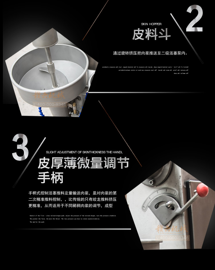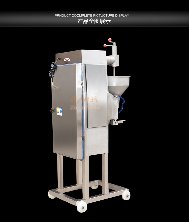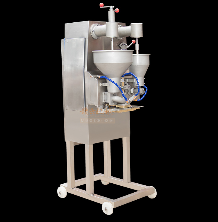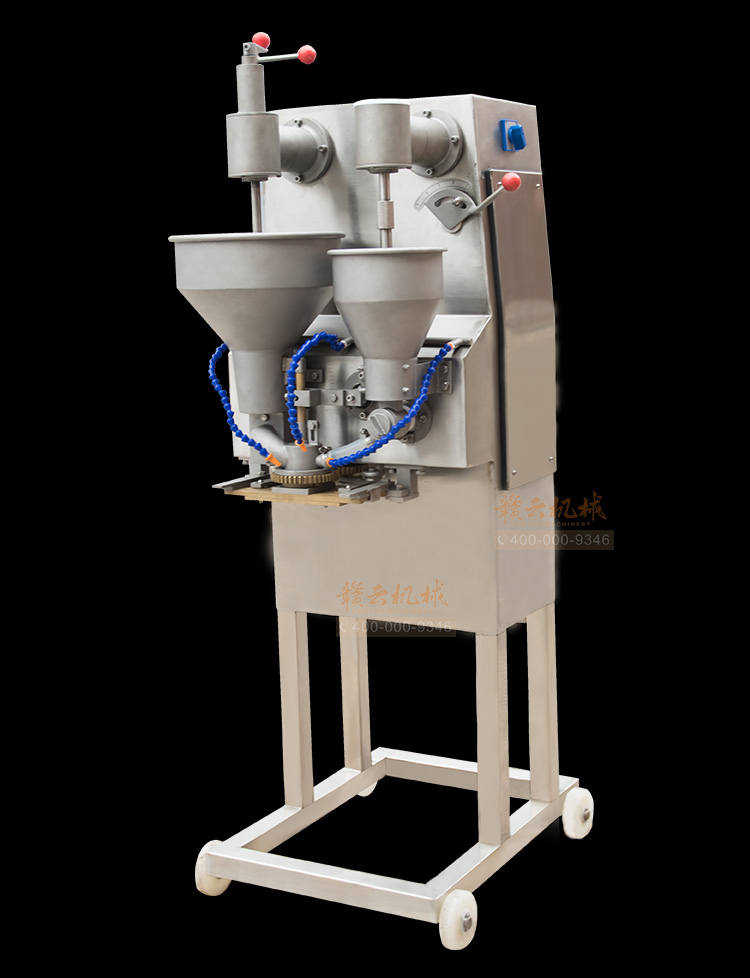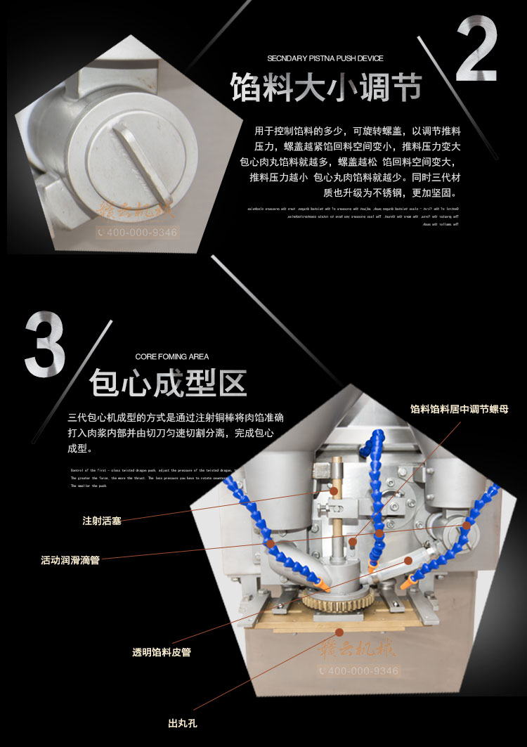 第三代包心肉丸機是在贛云二代包心肉丸機的基礎(chǔ)上,對二代包心機的成型切割部位進行優(yōu)化提速處理,達到每分鐘200粒的成型速度是二代包心機的兩倍,且推料控制方式還是選用一級絞龍推料和二次泵定量輸送相結(jié)合的原理,餡料控制改塑料螺蓋為不銹鋼抗氧化特殊處理螺蓋,餡斗新增絞龍擋板,可有效防止肉餡余留餡斗,更易肉餡的向下擠壓輸送作用,成型旋轉(zhuǎn)齒輪上新增潤滑滴管,彌補了二代包心機成型區(qū)域局部潤滑切刀的缺陷,做出的包心包餡丸表皮光滑,個體圓且大,成型速度快,無小尾巴等優(yōu)勢。綜上優(yōu)勢pk二代和目前其他廠家新款式包心肉丸機,故稱之為贛云第三代包心肉丸機!