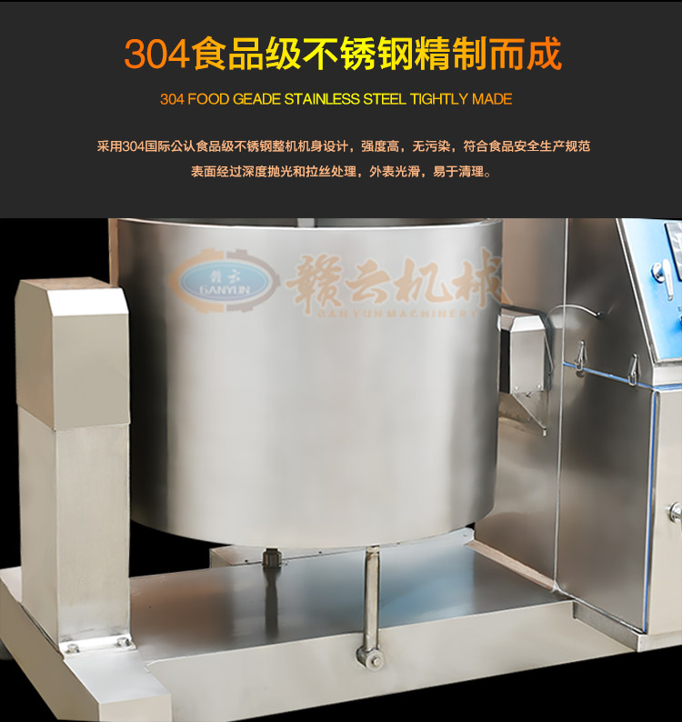 接觸食物均為304不銹鋼及食用PP材料,料桶為304號不銹鋼,桶底為R30圓角方便衛(wèi)生清洗及不留死角。