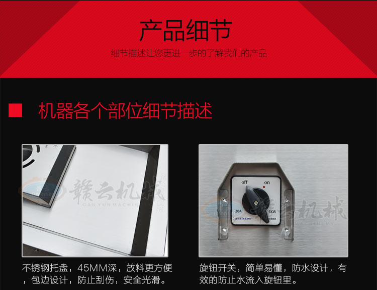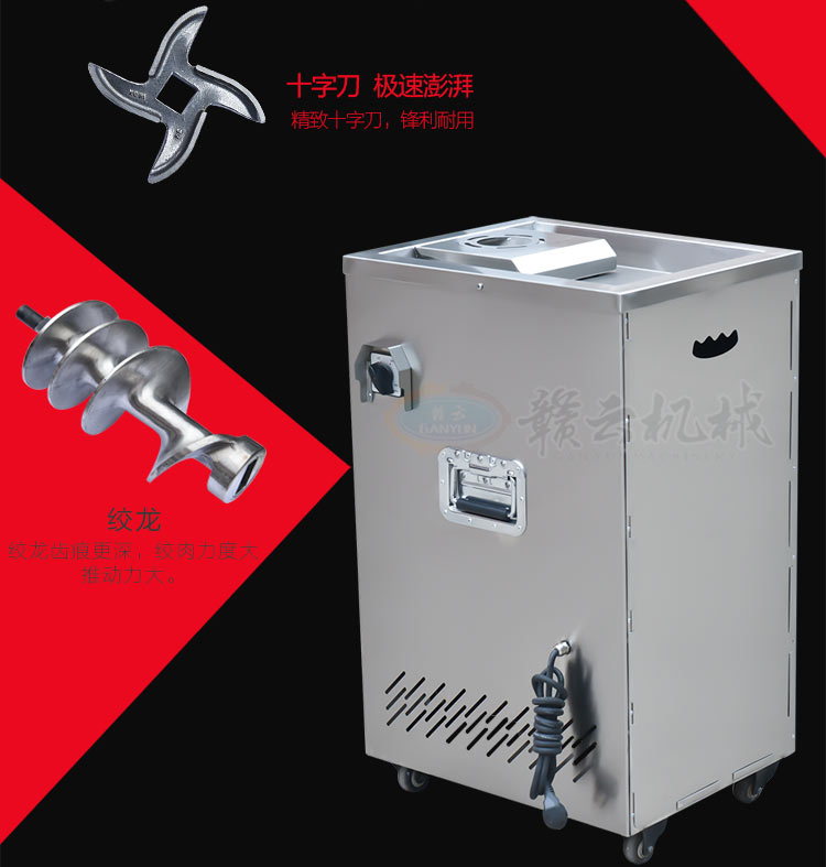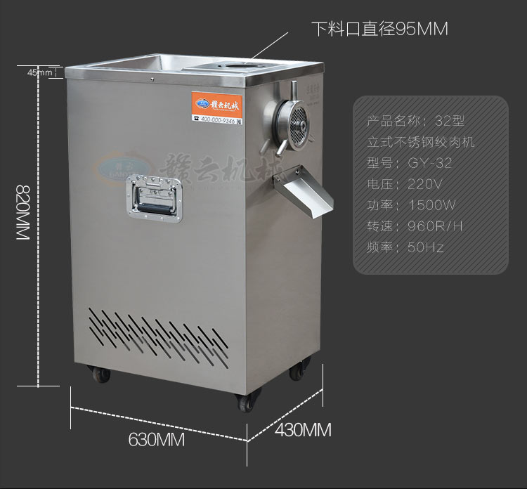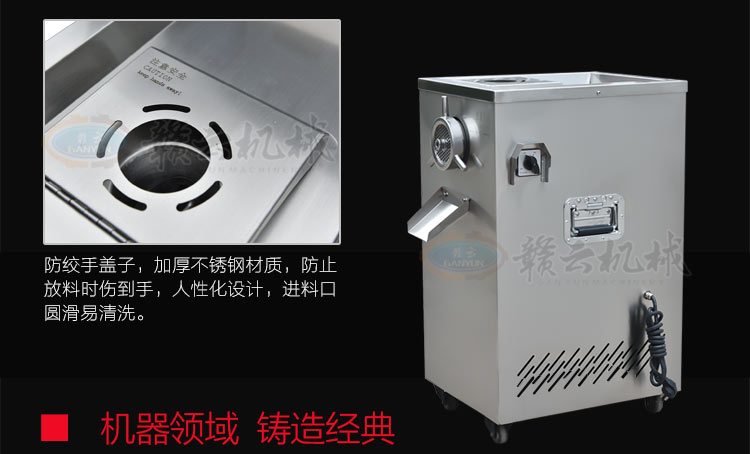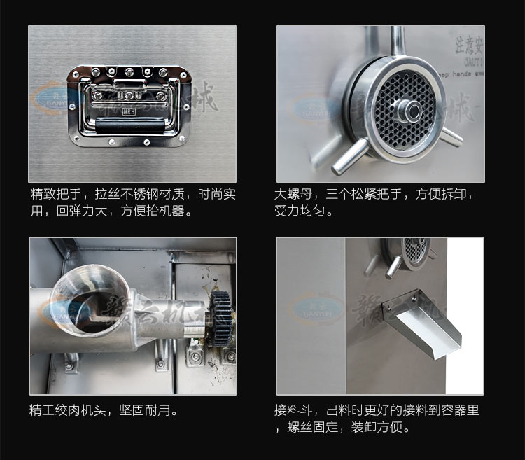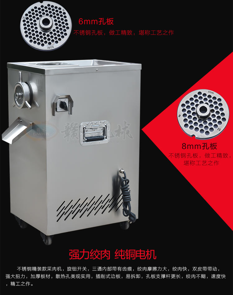 32型立式不銹鋼絞肉機(新),不銹鋼精裝款采肉機,旋鈕開關,三通內(nèi)部帶有齒痕,絞肉摩擦力大,絞肉快,雙皮帶帶動,強大扭力,加厚板材,散熱孔美觀實用,插銷式邊板支撐桿更長,絞肉不糊,速度快,精工之作。