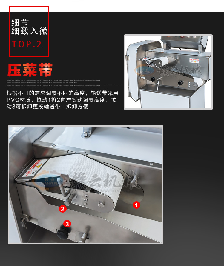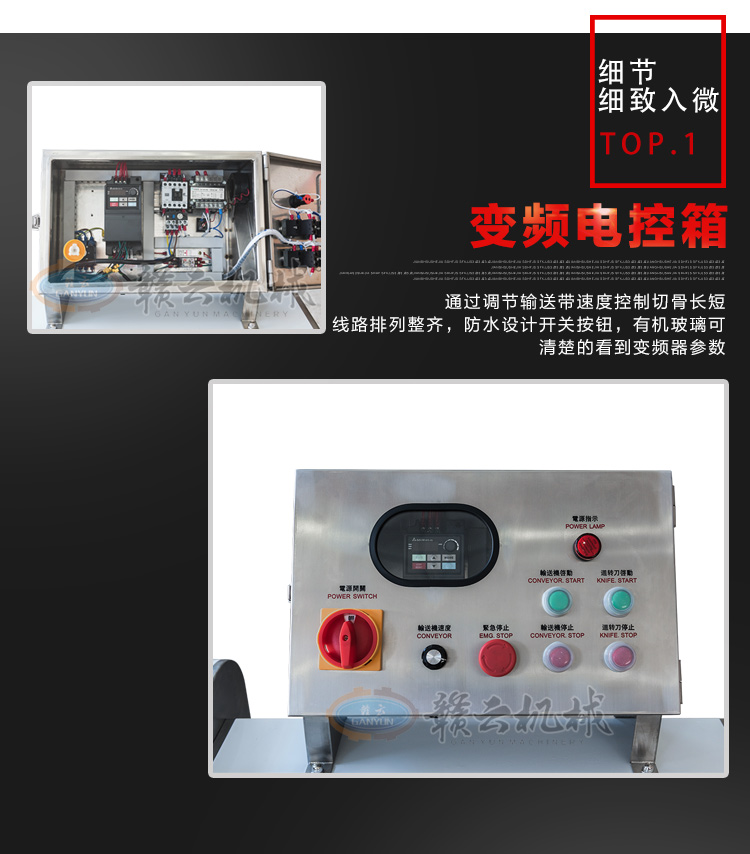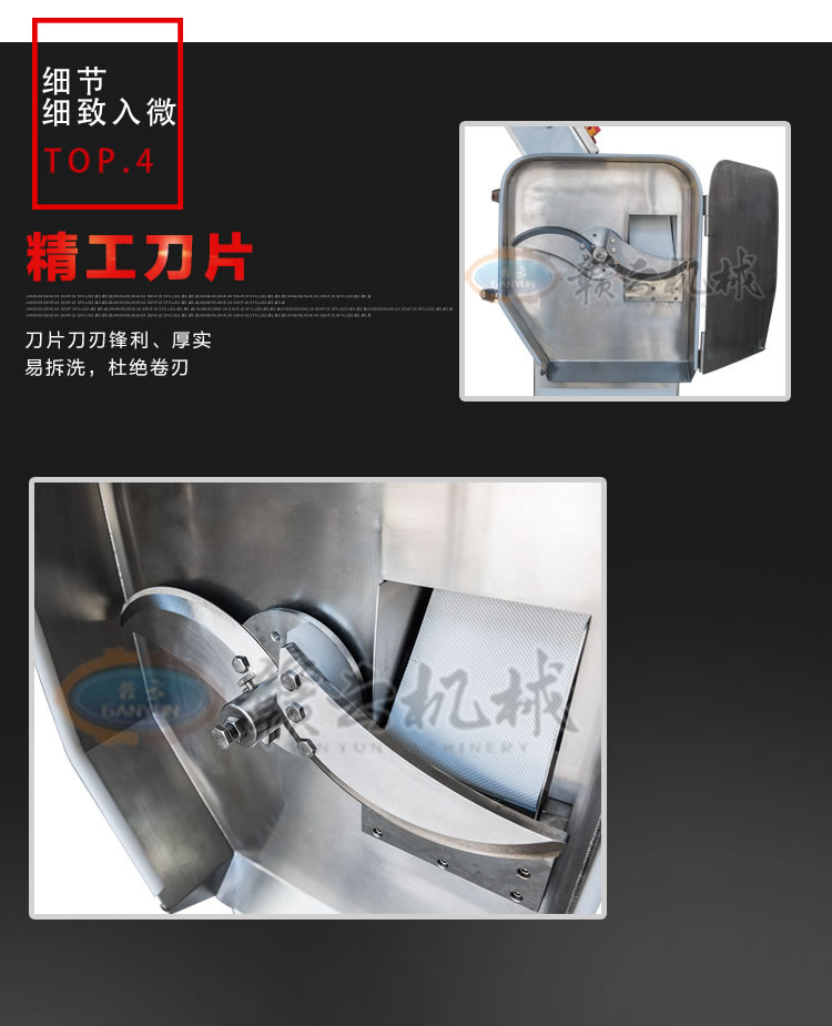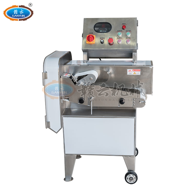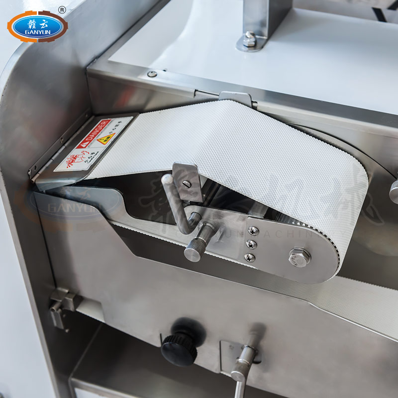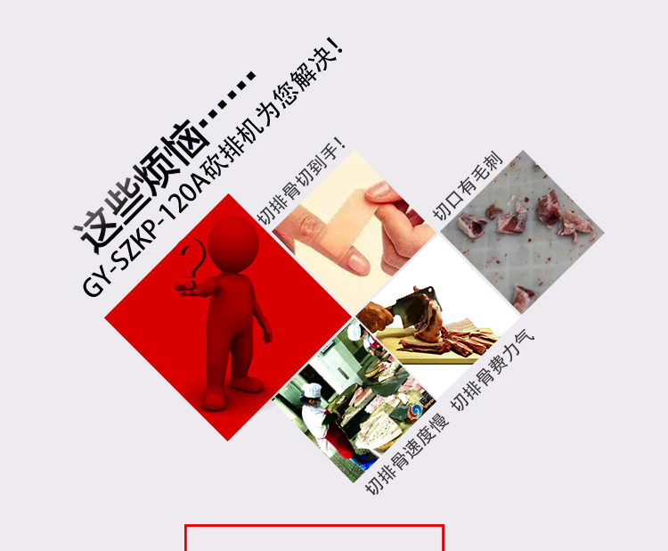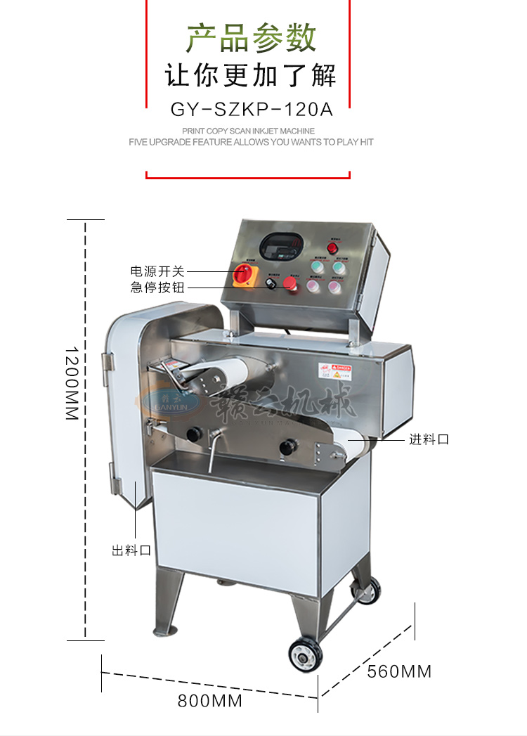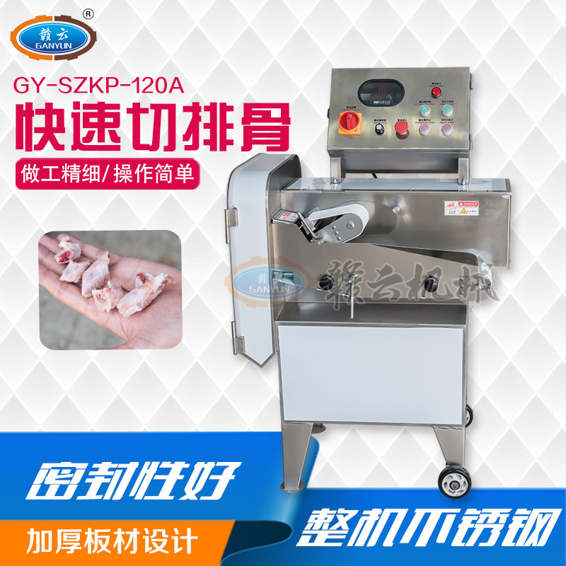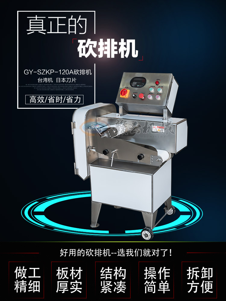 GY-SZKP-120A砍排機,優(yōu)質(zhì)刀片。通過調(diào)節(jié)輸送帶速度控制切骨長短線路排列整齊,防水設計開關按鈕,有機玻璃可清楚的看到變頻器參數(shù)。壓菜帶根據(jù)不同的需求調(diào)節(jié)不同的高度,輸送帶采用PVC材質(zhì),可拆卸更換輸送帶,拆卸方便。優(yōu)質(zhì)刀片,杜絕卷刃。機身背面散熱孔設計,電機運作時散發(fā)熱量,散熱孔設計更有效的保護電機的壽命,出料口傳感器設計,機器運作時打開刀盤門機器停止運作,安全穩(wěn)定,人性化設計。