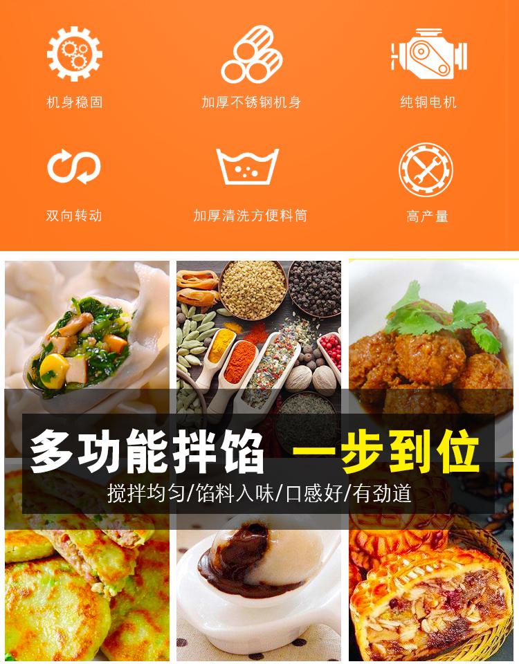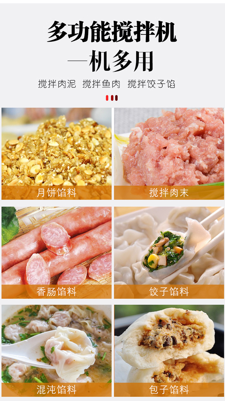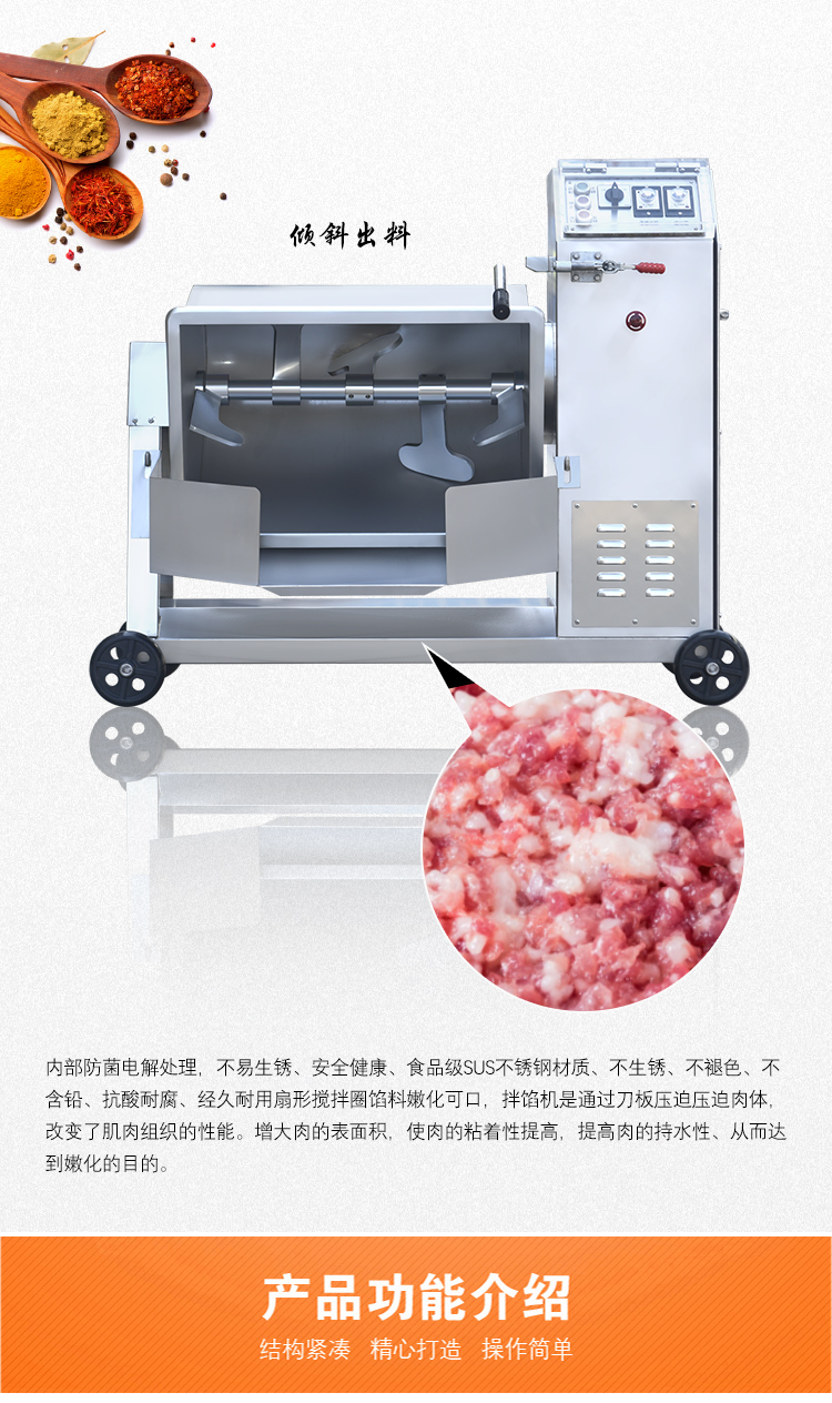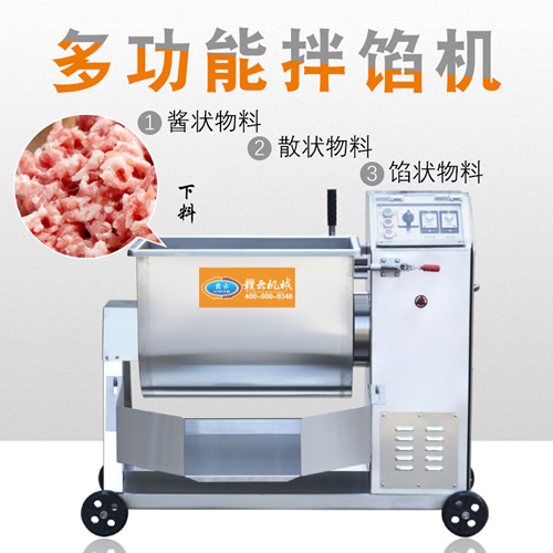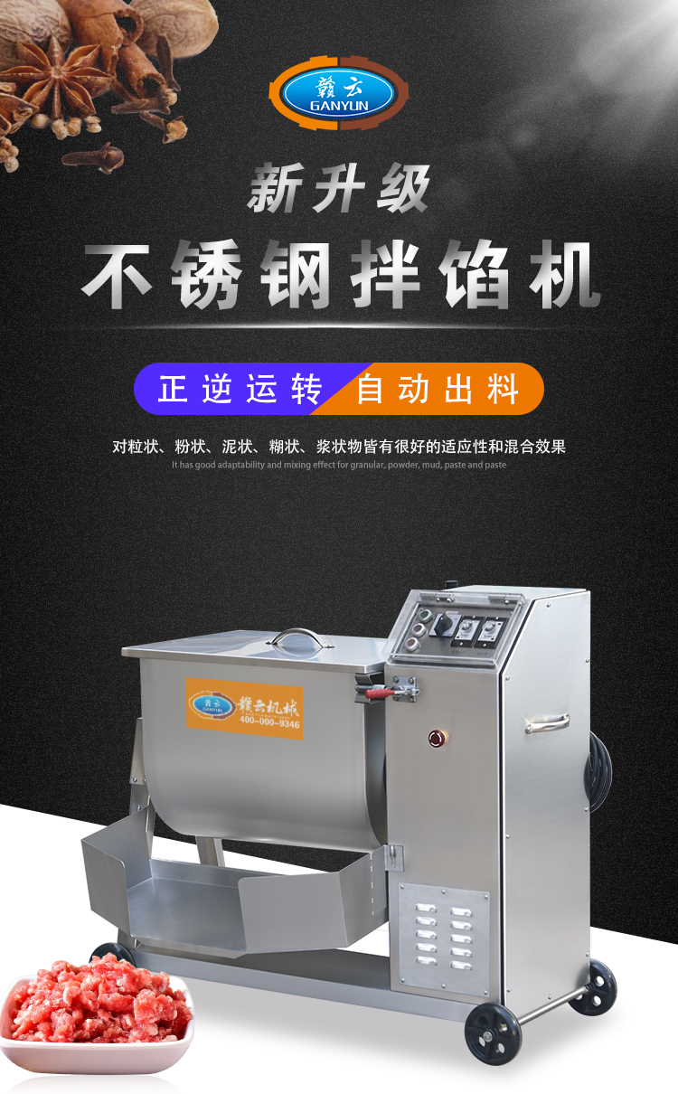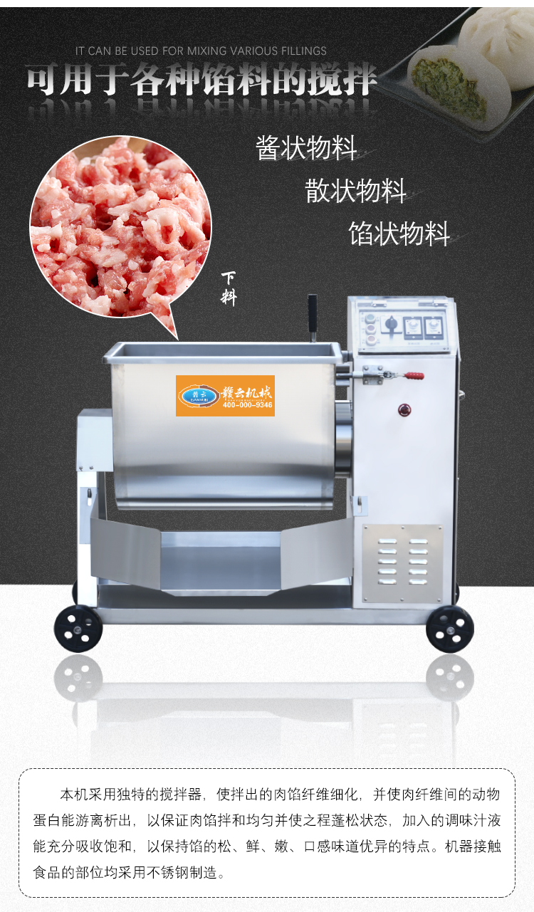 本機(jī)采用304不銹鋼材質(zhì)設(shè)計(jì),符合食品衛(wèi)生加工需求,絞龍型攪拌鋼軸可向內(nèi)向外雙向攪拌旋轉(zhuǎn)運(yùn)動(dòng),由倒順開關(guān)控制攪拌方向,適合粘稠度較大物料的攪拌,攪拌過程還對(duì)肉質(zhì)起嫩化效果,是肉餡、肉醬、菜餡等攪拌的上好設(shè)備。