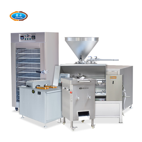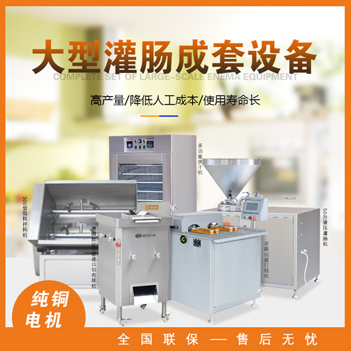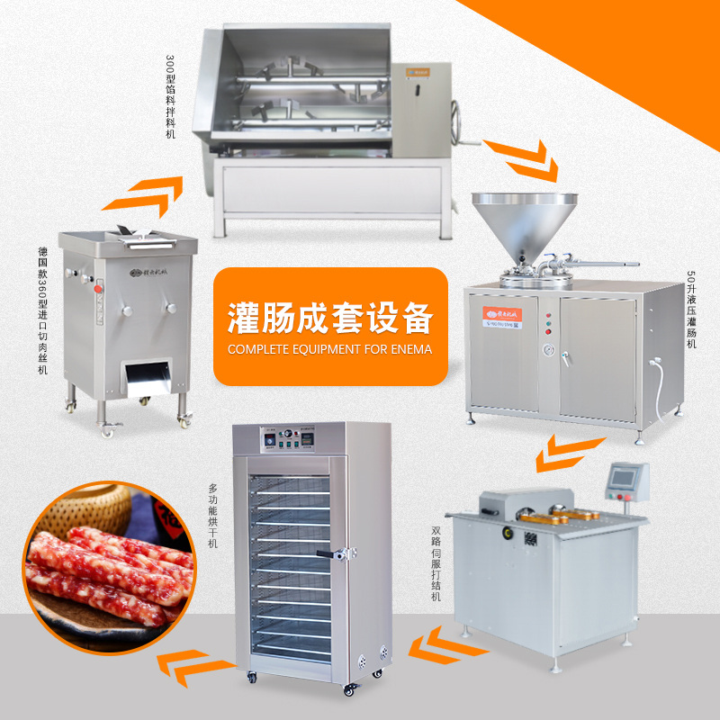 針對(duì)本地腸、臘腸、香腸、廣式香腸等生產(chǎn)加工設(shè)備,整套包含切肉機(jī)、拌餡機(jī)、灌腸機(jī)、扎線機(jī)、烘干機(jī)。