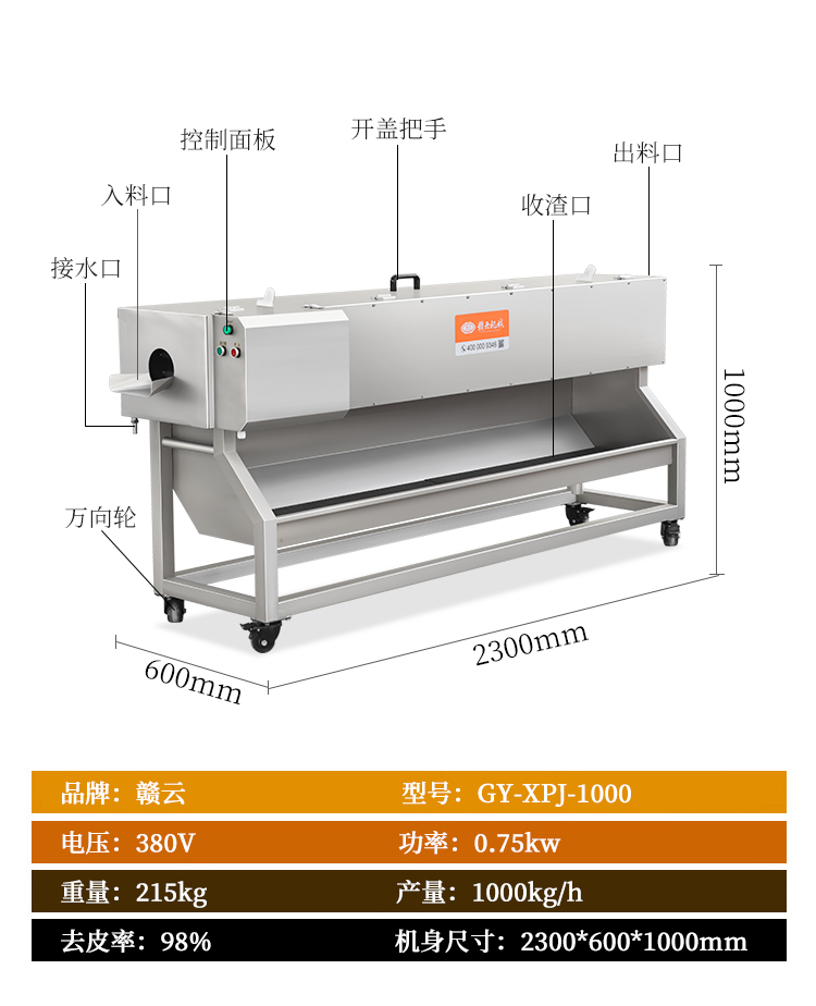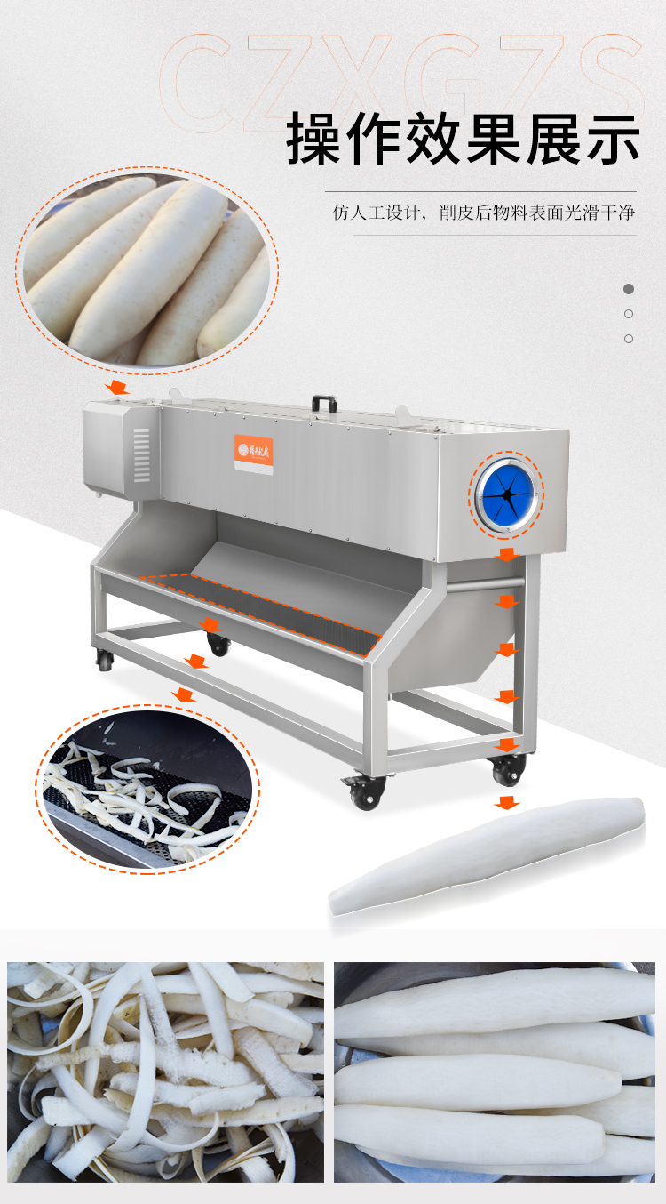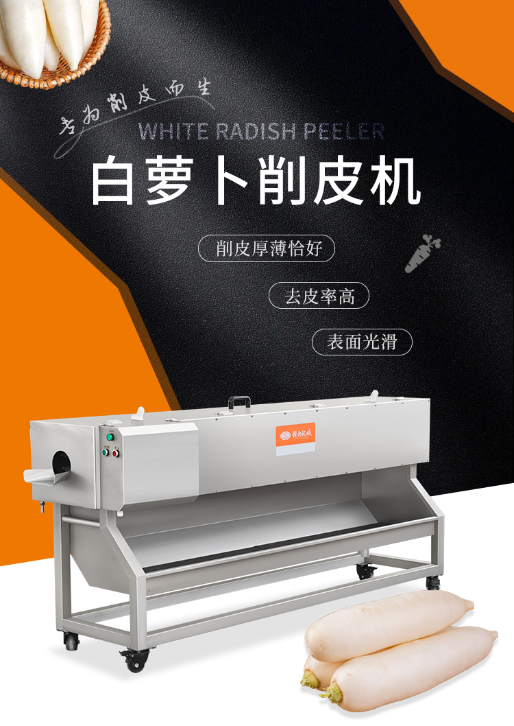 白蘿卜削皮機(jī)是贛云機(jī)械生產(chǎn)的一款實用型機(jī)器,針對于白蘿卜等長條型果蔬的自動去皮,多用于食品加工廠、快餐加工中心、商超、大型食堂等場所,機(jī)器使用雙向輸送橡膠彈簧設(shè)計,隨蘿卜大小自動伸縮抓料穩(wěn)定不易打滑,一次性去皮,去皮成品率高,機(jī)器采用不銹鋼材質(zhì),注重食品衛(wèi)生安全