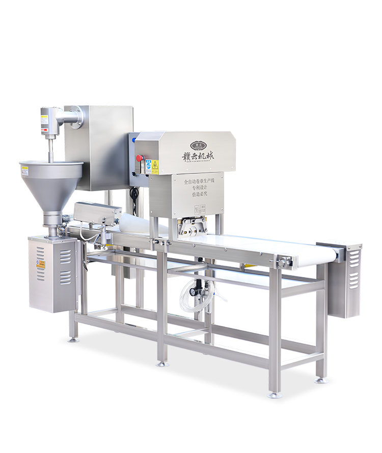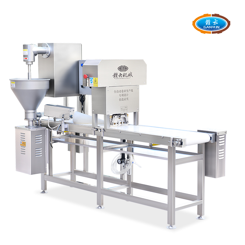 全自動卷章機也可以叫廣章機,是一款取代手工制作各種潮汕廣章美食、腐皮肉卷的機器。卷章機有兩個型號,分別是單管單頭的單頭卷章機和雙管雙頭的雙管卷章機。全自動卷章機擁有自動包漿、自動肉卷成型、自動肉卷切斷,讓肉卷生產(chǎn)效果高。卷章機做出的各類肉卷美食造型美觀,機器自帶獨特錐形成型裝置,讓肉卷成型圓度好,接近手工制作的工藝。