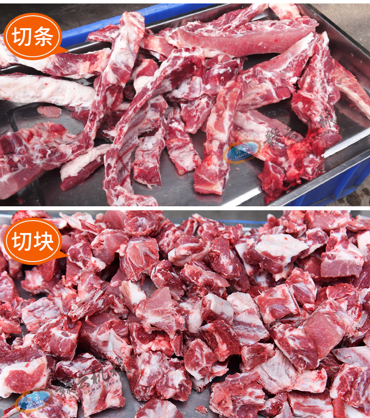 用于新鮮豬排骨、羊排、雞、鴨、魚、兔子、豬蹄等的切條切塊加工。