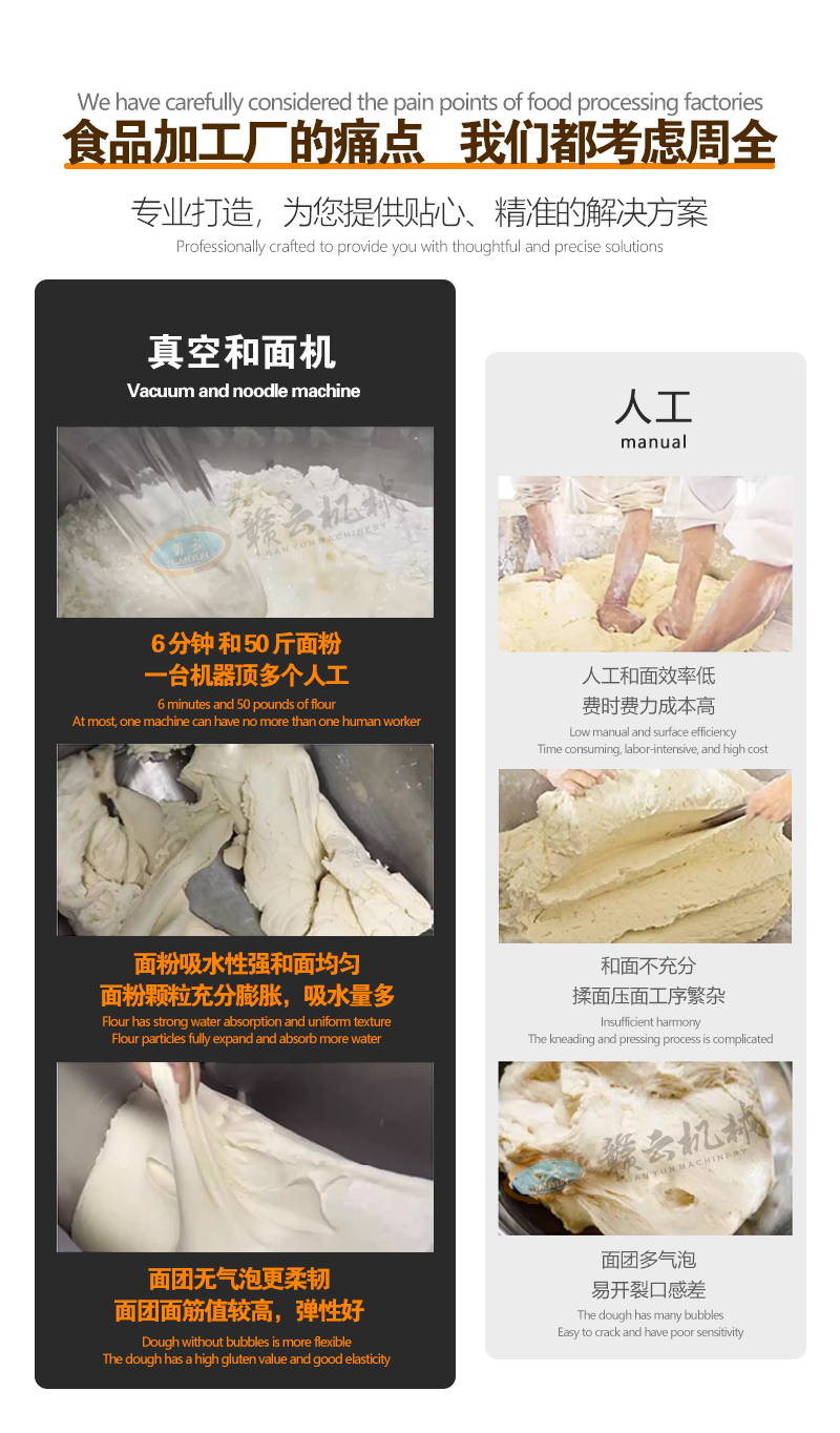 適配食品廠、餐飲及面點(diǎn)加工,用于面條、餃子皮、包子皮等面食制作,真空揉面鎖鮮鎖水,提升面團(tuán)筋性與口感。