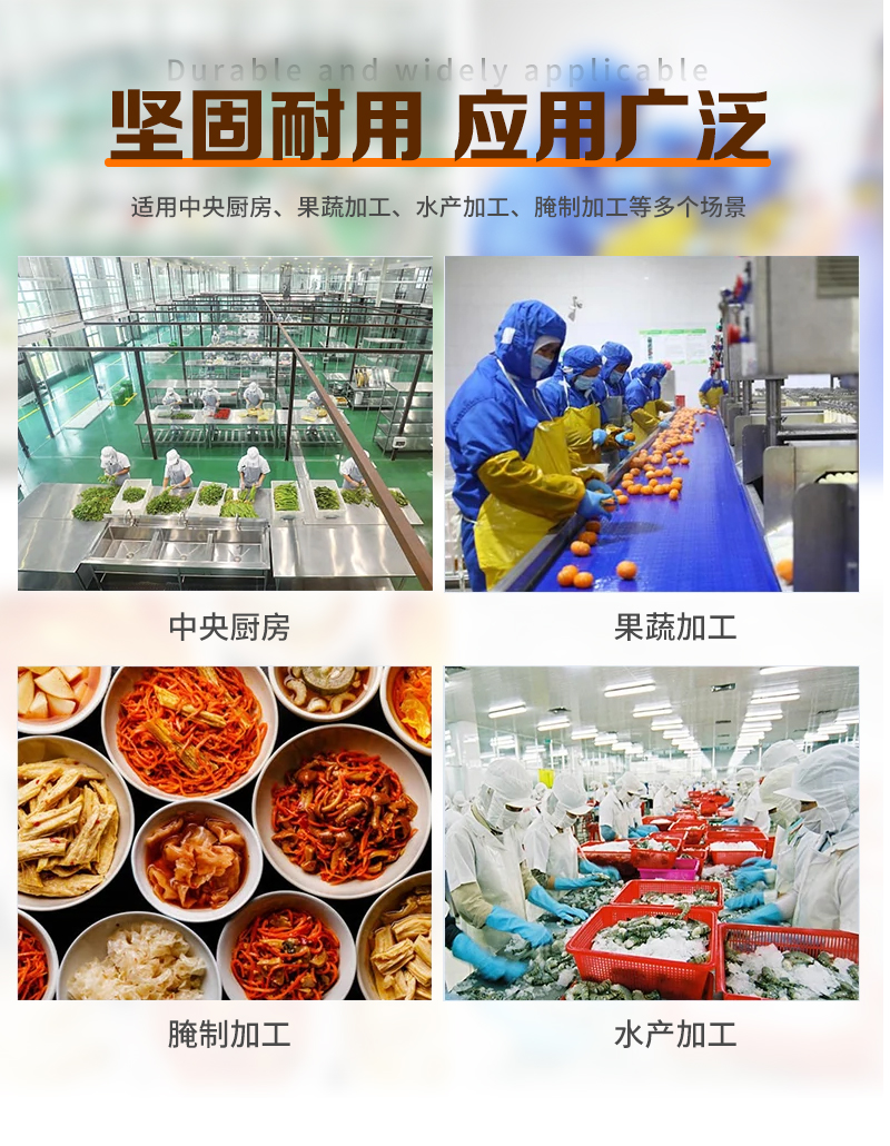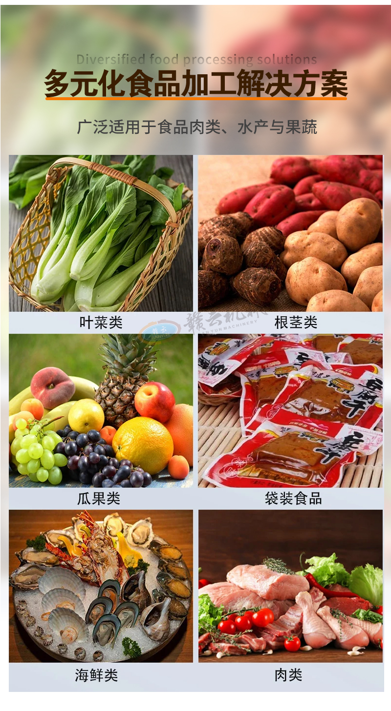 適用于各類葉菜、根莖類果蔬、水產(chǎn)、腌制品等物料的清洗加工,廣泛應(yīng)用于中央廚房、凈菜加工廠、果蔬加工企業(yè)、水產(chǎn)加工廠、食品腌制廠等商用食品加工場(chǎng)景。