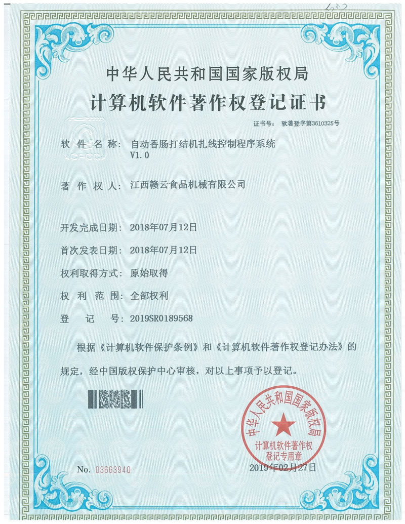 計算機軟件著作權(quán)登記證書(自動香腸打結(jié)機扎線控制程序系統(tǒng))