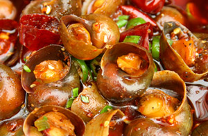 4、洗凈炒鍋,旺火燒熱,下油,倒入田螺,然后將精鹽用清水攪勻,淋入鍋內(nèi)炒勻,加蓋約3 分鐘,放豆豉、蒜、紫蘇茸透炒一次,再加蓋約3分鐘,再炒,直至透熟。