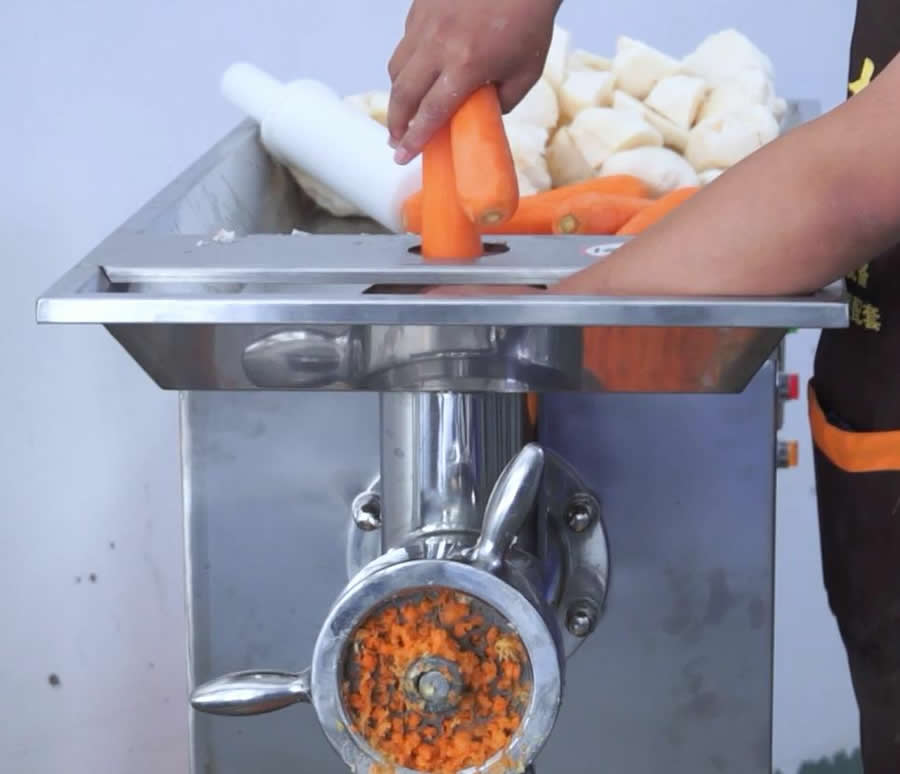 首先將所有原料準(zhǔn)備好,原料有:鮮豬肉(比例為:瘦6肥4)、胡蘿卜、生姜、小蒜、馬蹄、淀粉、冰水等。第一步是需要將原料通過絞肉機(jī)絞碎,這一步是使用贛云42型不銹鋼絞肉機(jī),這臺機(jī)器可以用于鮮肉、微凍肉類、蔬菜等絞碎,機(jī)器動力強(qiáng)勁,絞肉速度快,每小時可達(dá)600公斤。
