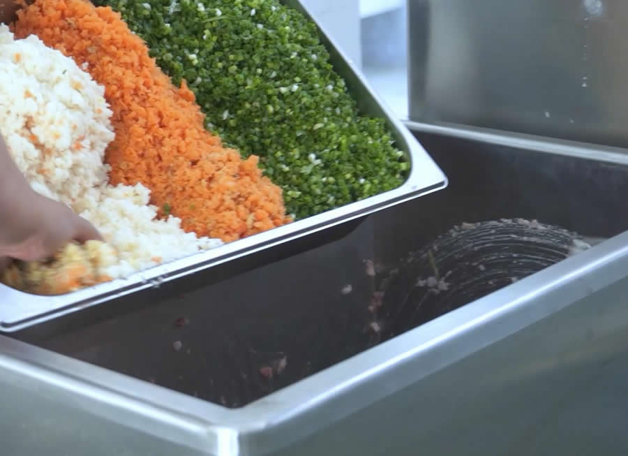 將通過絞切處理后的食材根據(jù)工藝比例倒入這臺自動化不銹鋼拌餡機(jī)。拌餡機(jī)可對粒狀、粉狀、泥狀物料根據(jù)需求設(shè)定攪拌時間,機(jī)器擁有5槳交錯攪拌,操作過程中可自動切換正反轉(zhuǎn),這臺機(jī)器單次一桶可加工100L物料。