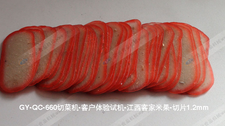 贛云牌多功能切菜GY-QC-660型切江西客家米果片,來自江西龍南縣客戶要求厚度在1.2-1.5mm之間,該設(shè)備可切范圍0-20mm,試機(jī)成功。
