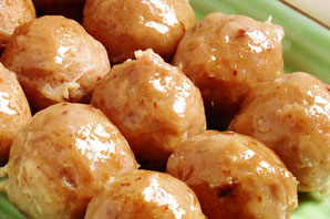 4、貢丸的成型:普遍的貢丸制作都是采用挖式貢丸成型機(jī)成型,半開明舀勺模擬手工舀丸子成型貢丸,這種貢丸成型機(jī)成型出來的貢丸圓度更好,所用模具也比普通的肉丸要大一些,是專門用于成型貢丸的,如贛云牌的170型貢丸成型機(jī)就是采用半開明舀勺成型貢丸。