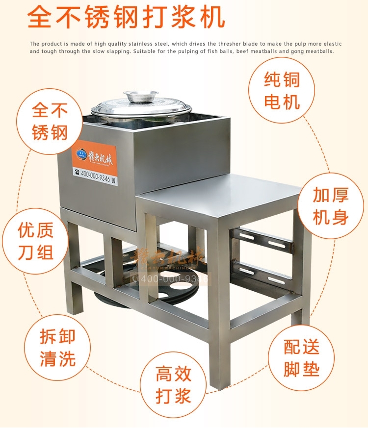 這臺(tái)慢速打漿機(jī)通過大皮帶輪減速帶動(dòng)打漿機(jī)刀片打漿,這樣通過慢速拍打,可以使拍打過程中能對(duì)肉類組織細(xì)胞拉絲重組,加大吸收水分,提高肉類的嫩化程度,讓打出來的肉漿制成丸子后更軟彈有嚼勁。適合魚丸、牛肉丸和貢丸的制漿之用。