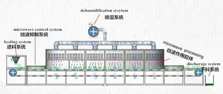 2.微波烘干區(qū)域:烘干區(qū)域是一個位于隧道中間區(qū)域,待烘干的物體通過輸送帶進(jìn)烘干室內(nèi)進(jìn)行快速烘干。烘干室通常排濕系統(tǒng)和輸送系統(tǒng),周邊由金屬材料構(gòu)成,以防止微波輻射泄露出去。