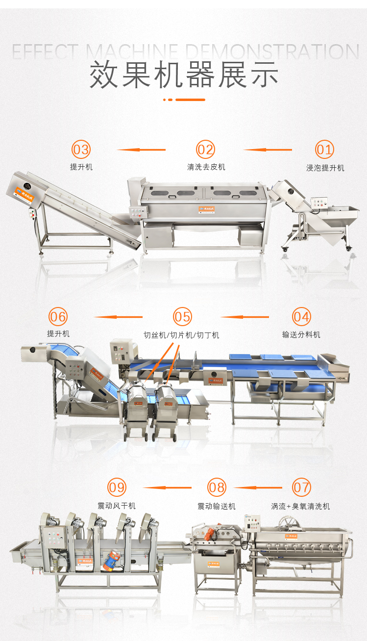 他集浸泡機(jī),清洗機(jī),提升機(jī),切割機(jī),風(fēng)干機(jī)等多種機(jī)器為一體,實(shí)現(xiàn)了瓜果從剛摘到可下鍋炒的全部過程,完美的節(jié)省了人力及時(shí)間,下面的圖片將詳細(xì)介紹這些設(shè)備。