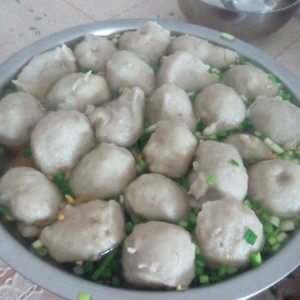 將打漿好的豬肉帶回家然后煮水,溫度差不多60的時候即可以開始用手擠出肉丸形狀用勺子挖入水中成型。
