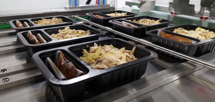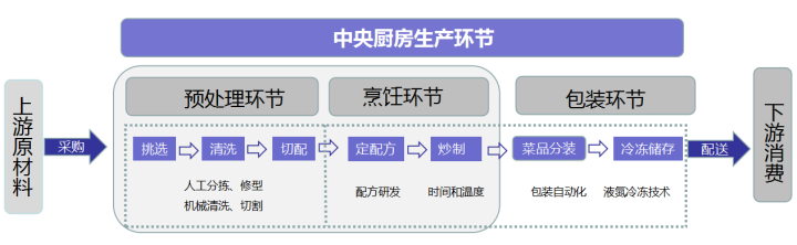 預(yù)制菜工藝流程:粗加工、細(xì)加工、加熱烹調(diào)、包裝、冷卻、配送等六個(gè)環(huán)節(jié)。