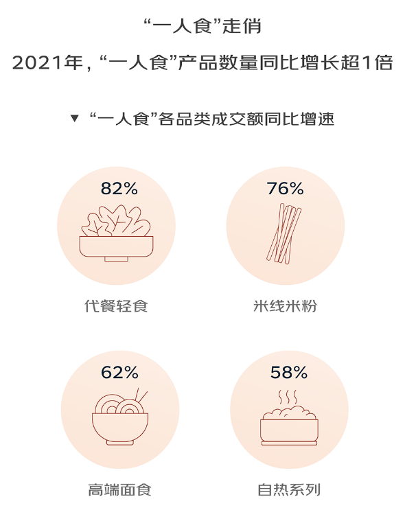 數(shù)據(jù)顯示,2021年代餐輕食品類成交額同比增長(zhǎng)82%,同時(shí)女性群體的兒童速食成交額同比增長(zhǎng)78%。所以,建議新入局企業(yè)可聚焦這類需求,在產(chǎn)品設(shè)計(jì)上突出健康和便捷,通過(guò)短視頻等新型消費(fèi)渠道精準(zhǔn)對(duì)接這些消費(fèi)者。